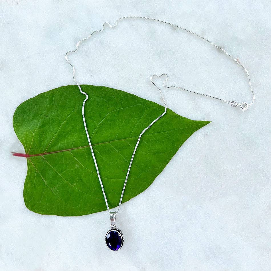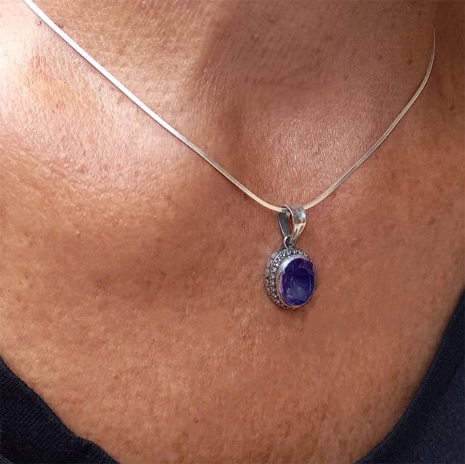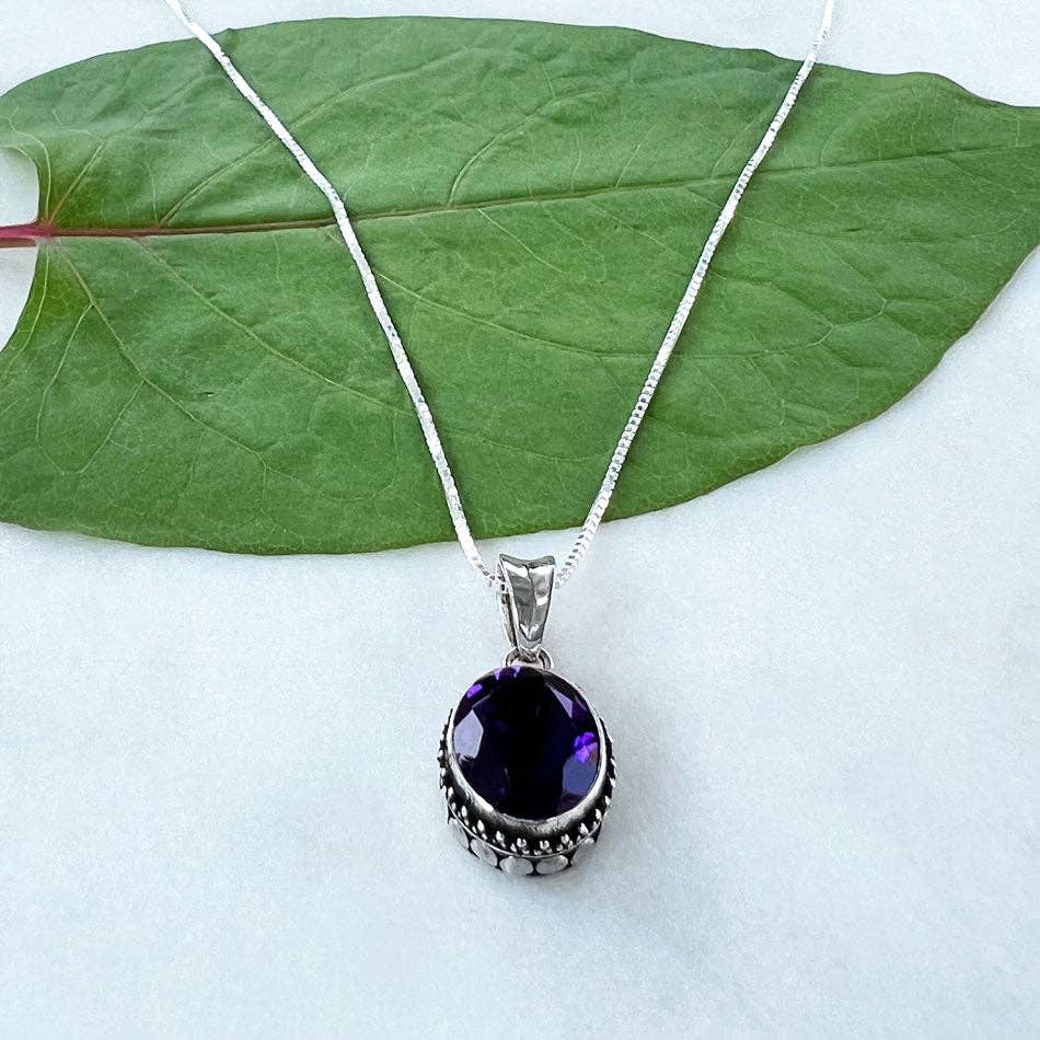 This stunning necklace is handmade by talented silversmiths in Bali.  It features a semi-precious amethyst stone encased in a sterling silver filigree pendant. Pendant measures approximately 1/2" long by 3/8" wide (not including bale). 18" Sterling silver chain. .925 Sterling silver, amethyst All of our products are shipped with cards containing information about fair trade and the corresponding artisan group. ABOUT THE ARTISANS This jewelry was designed and handcrafted by a close knit group of artisans who live and work together on a family compound in Bali.  Bali silversmiths are renowned for a traditional and unique filigree style; these artisans pride themselves on honoring their culture while incorporating an innovative and modern touch with each piece they create.  The intricate filigree styles are handmade by the women in the group.  As one of the men in the community stated with a laugh: "the men don't have the patience."