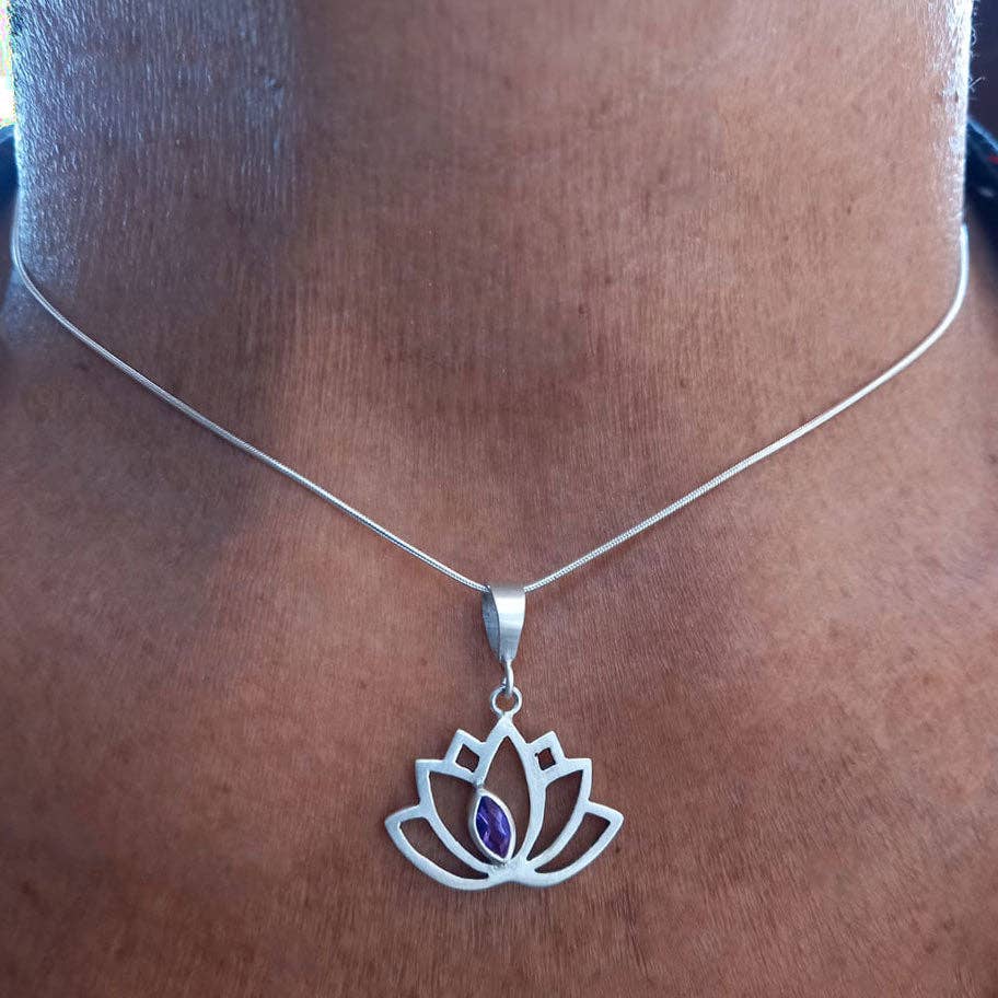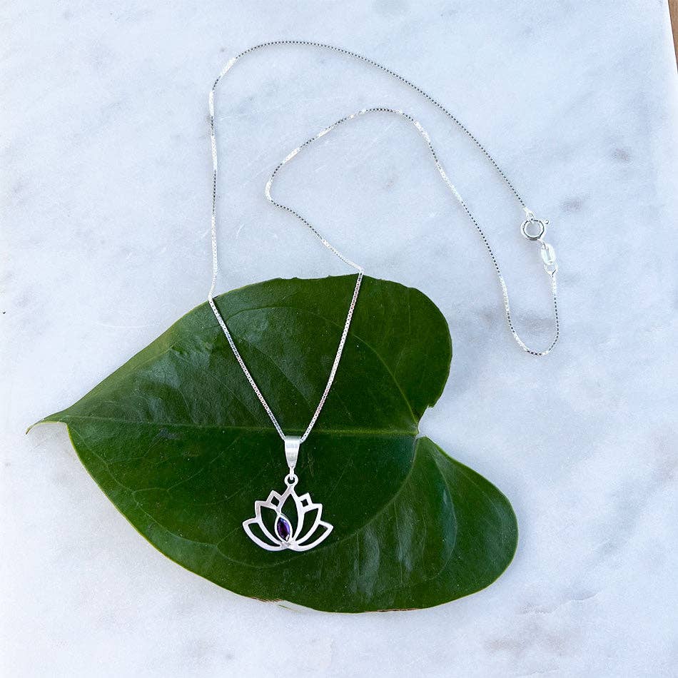 This exquisite necklace is handmade by talented silversmiths in Bali. It features a brushed sterling silver lotus pendant with a semi-precious amethyst stone. Pendant measures approximately 1" high (including bale) by 1" wide. 18" Sterling silver chain. All of our products are shipped with cards containing information about fair trade and the corresponding artisan group. ABOUT THE ARTISANS This jewelry was designed and handcrafted by a close knit group of artisans who live and work together on a family fair trade cooperative and compound in Bali.  Bali silversmiths are renowned for a traditional and unique filigree style; these artisans pride themselves on honoring their culture while incorporating an innovative and modern touch with each piece they create.  The intricate filigree styles are handmade by the women in the group.  As one of the men in the community stated with a laugh: "the men don't have the patience."