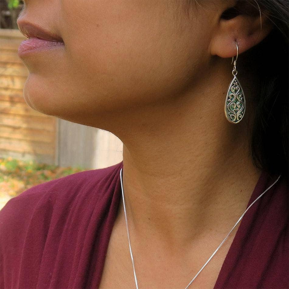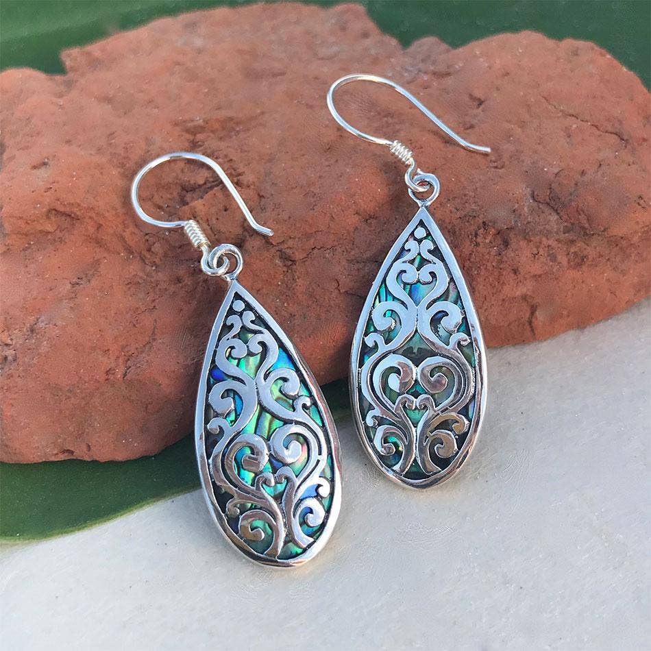 These stunning earrings were handmade by talented silversmiths in Bali. They feature an abalone shell overlaid with an intricate sterling silver scrollwork design. The shell changes hue according to the light, and contains numerous gorgeous colors. Measure 1 1/8" long and 1/2" wide. .925 Sterling silver All of our products are shipped with cards containing information about fair trade and the corresponding artisan group. ABOUT THE ARTISANS This jewelry was designed and handcrafted by a close-knit group of artisans who live and work together on a family compound in Bali. Bali silversmiths are renowned for a traditional and unique filigree style; these artisans pride themselves on honoring their culture while incorporating an innovative and modern touch with each piece they create. The intricate filigree styles are handmade by the women in the group. As one of the men in the community stated with a laugh: "the men don't have the patience."