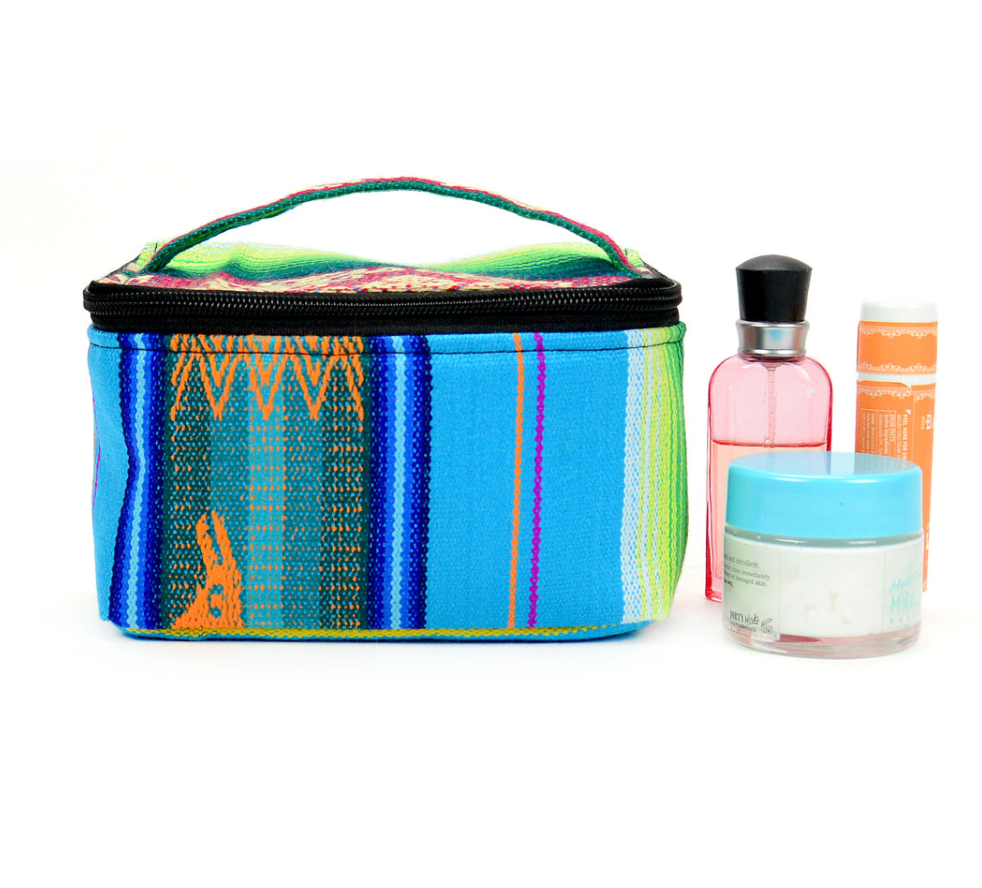 Handy toiletry bag for home or travel. Assortment of different patterns and colors. Acrylic. Zip closure, fully lined. Top handle. Made in Ecuador. Sold Individually