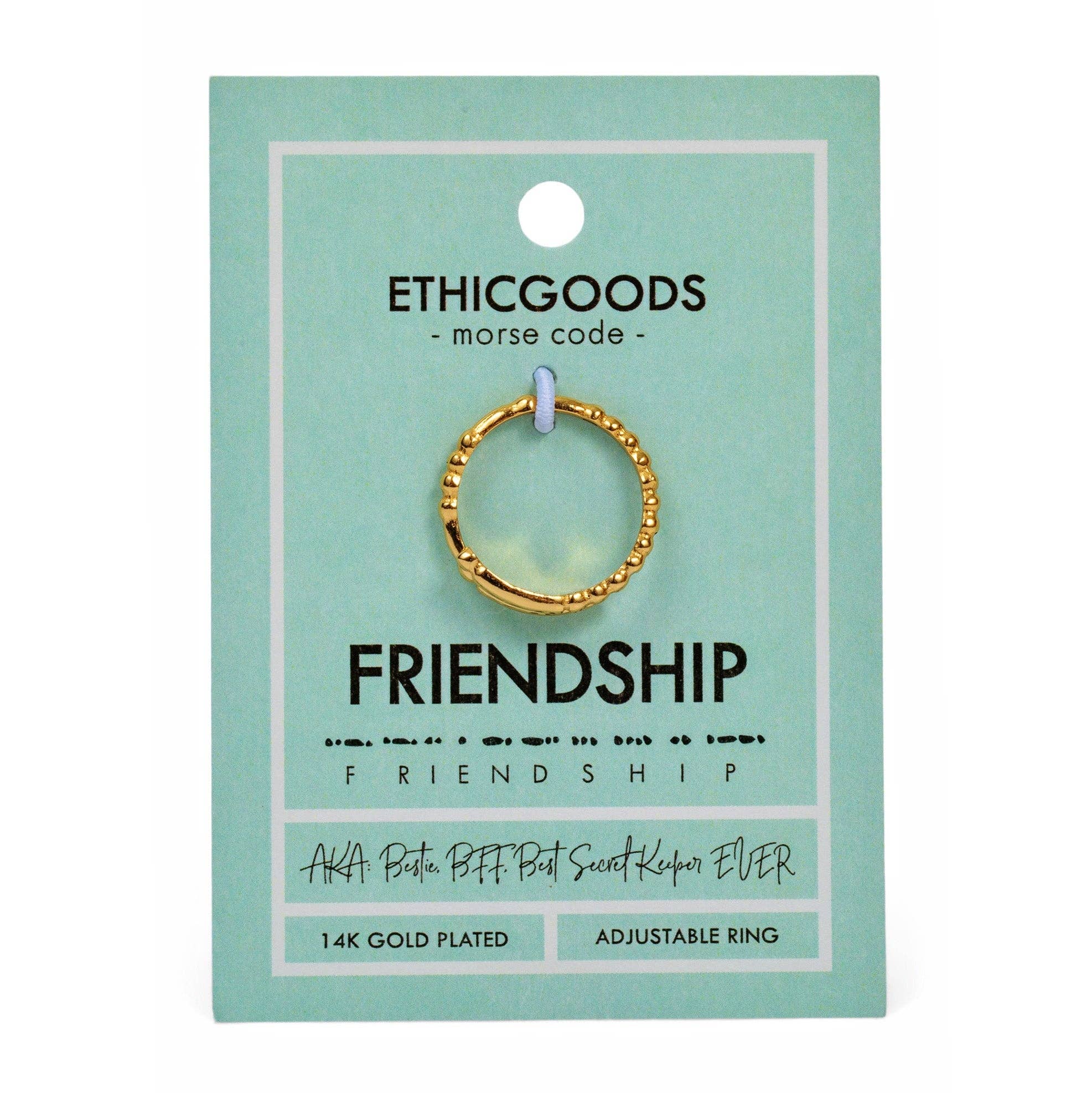 FRIENDSHIP AKA: Bestie, BFF, Best Secret Keeper EVER. Take your style up a notch with this unique Morse Code Ring! Crafted from 14k gold-plated metal and designed in a morse code pattern, this adjustable ring will make a statement. Uncover the hidden meaning behind the design and show that you care with this ethically handmade peice. Each ring has the Morse Code pattern on the outside and the word inside. What word will you choose? We’d love to hear what your jewelry means to you. Share your story and photos with us! @ethicgoods Details * 14k gold plated sterling silver *