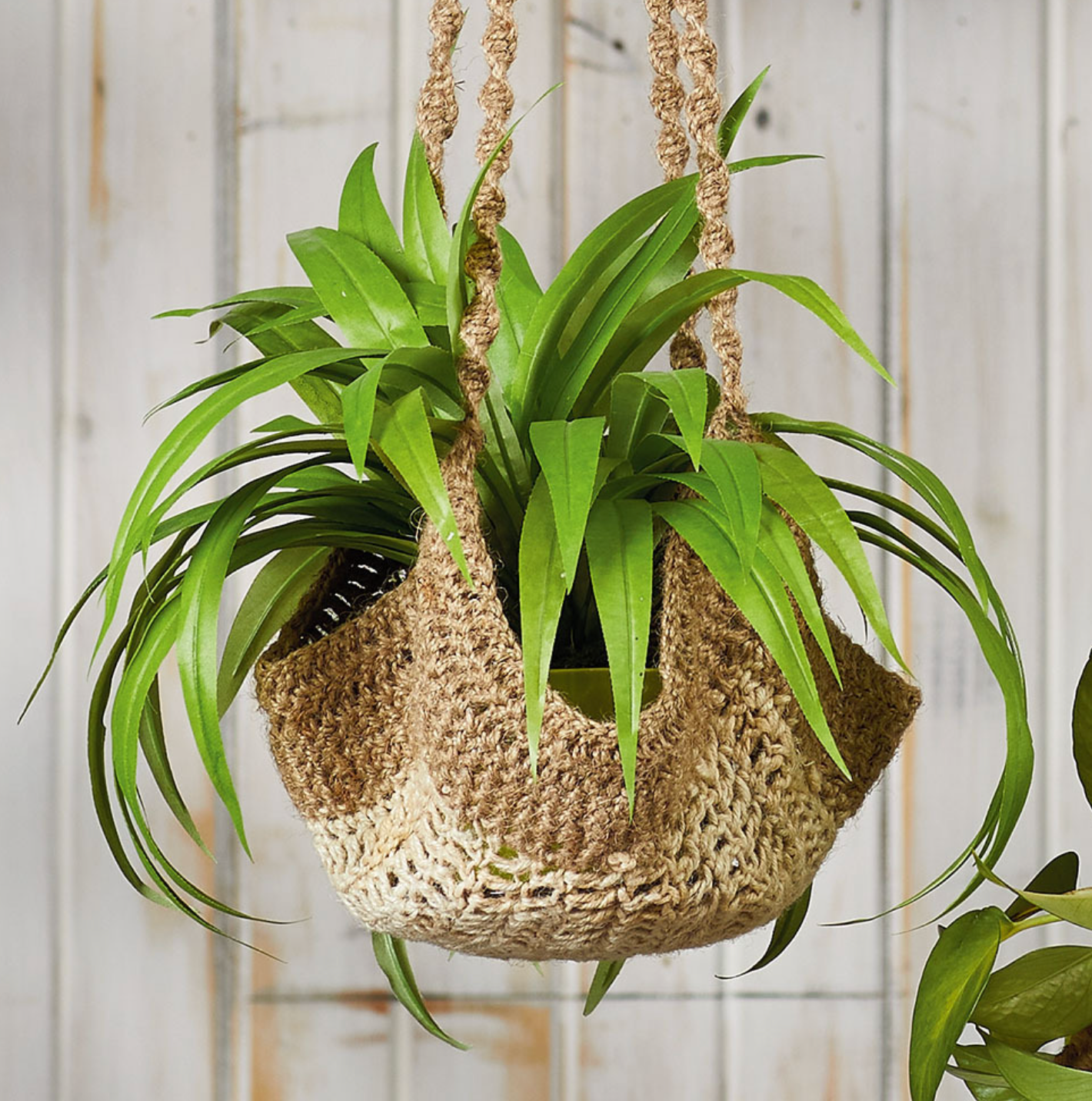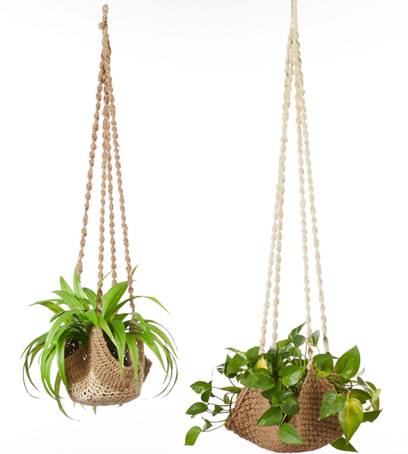 This eco-friendly plant hanger is crocheted by hand from all-natural jute string, and is perfect for small potted houseplants and succulents. Each features a loop for hanging. Two style options available: solid color or two-tone. Made in India.