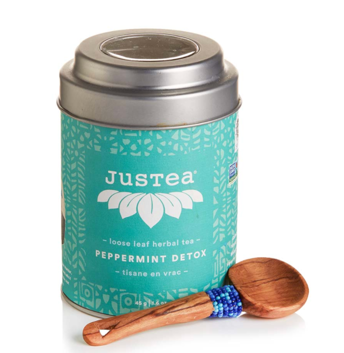 Fair trade tea from small-scale farmers in Kenya is some of the world's most flavorful. Peppermint Detox is packed with antioxidants, whole leaf peppermint, and lemongrass to create this delicious and revitalizing blend. Tins contain loose leaf tea; each 1.6 oz tin makes 40 cups and comes with a hand-carved teaspoon. Re-steep for a second cup! Ingredients: Organic lemongrass, peppermint 100% natural ingredients are grown pesticide free.
