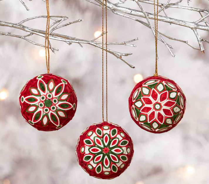 Remarkable in detail and craftsmanship, these ornaments are replete with dozens of colorful paper strips, each uniquely coiled, wrapped, and pinched by hand to create intricate patterns. Sold Individually. Designs will vary. each: 2"dia