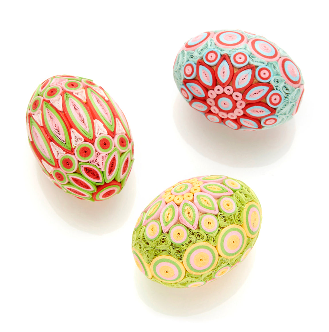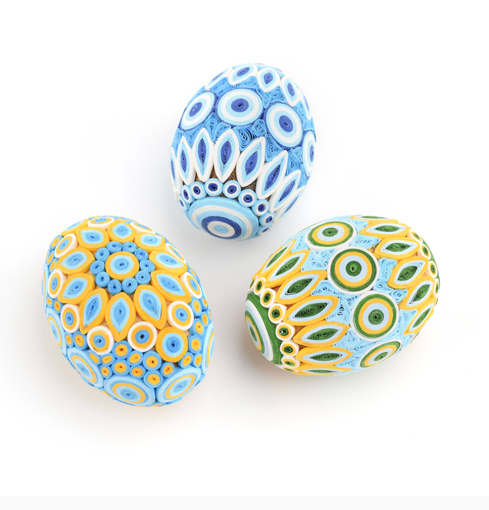 Remarkable in detail and craftsmanship, these eggs are covered with dozens of individually coiled paper details, in beautiful colors and patterns. Sold individually. Each piece is 2" h.