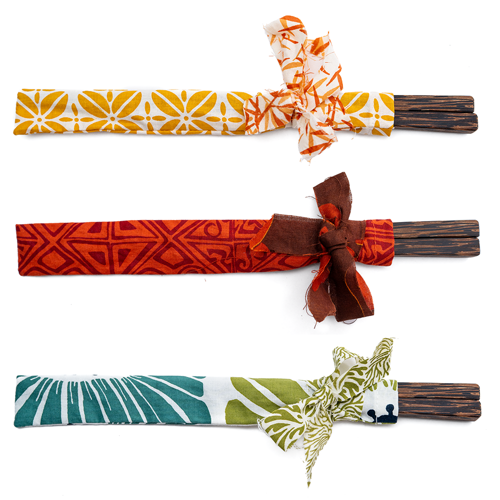 These hand made, square cut chopsticks are made of sustainably grown and harvested Palm Wood. They have a plain waxed finish, and come in an adorable cotton wrap. The wraps are made with bolt ends of our Balizen seaweed print fabrics and come in assorted colors that match all our tableware. For long lasting chopstick use, please hand wash only. Dimensions -- .25" x .25" x 9" (1 x 1 x 23cm) Sold Individually