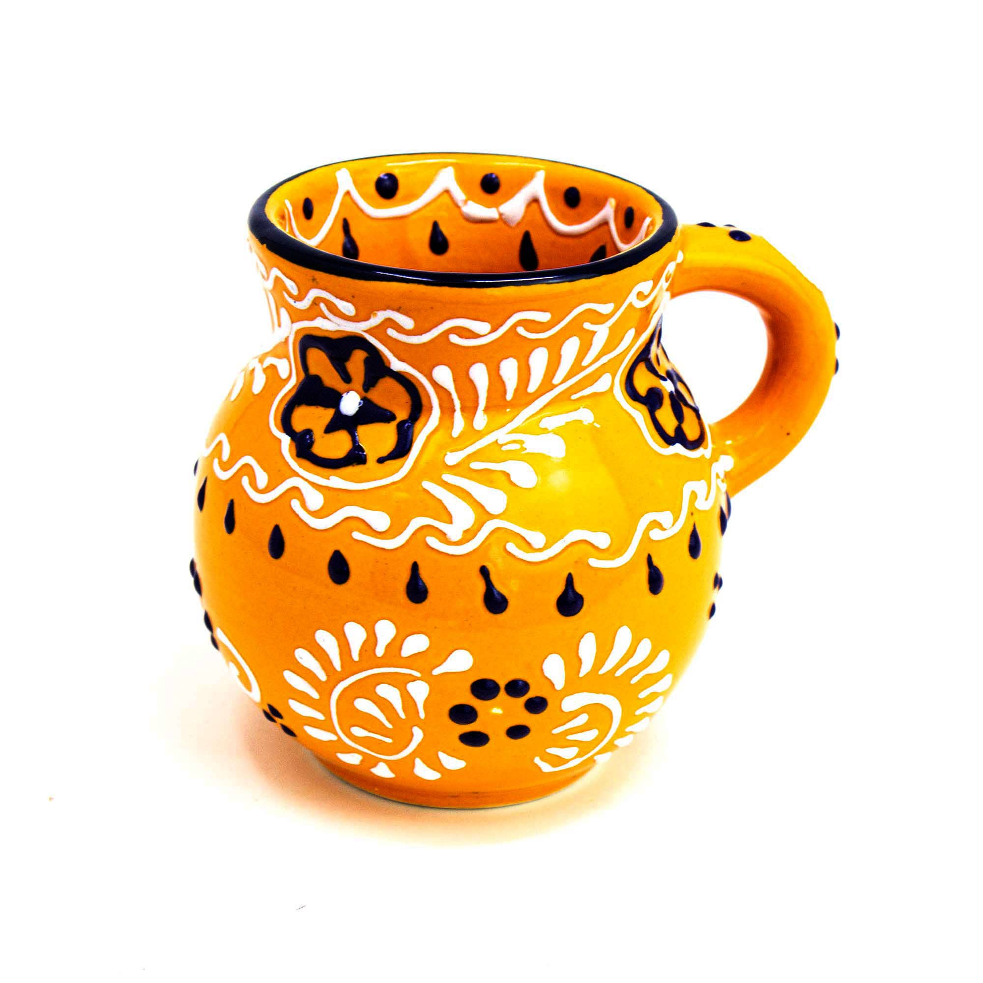 Sold Individually. Lead-free, dishwasher and microwave safe, this richly-colored mug shaped like a beaker is handcrafted and painted by Mexican artisans. While a very functional piece, the outside, inside, and handle are covered with a textured pattern making each piece unique. 4 inches tall.Meet the Artisans Theres no sign to find the small family-owned ceramic workshop in the state of Guanajuato. Behind the large wooden gate, women artisans are hand painting unfired ceramics while men work the kilns, as they have since the late 70s. Each piece has personality from the dots and swirls to the handpainted logo on the bottom. And each is lead free, microwave and dishwasher safe.