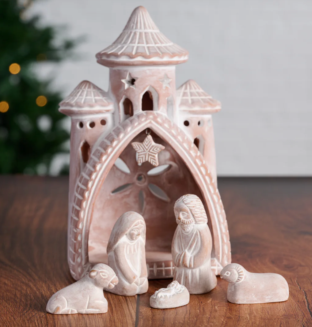 Sure to become a part of your treasured holiday traditions! Inspired by elements of South Asian architecture, this lovingly rendered six-piece nativity set brings a warm, handcrafted feel to the iconic scene. The creche features the Holy Family attended by a cow and sheep under the watchful gaze of a star suspended from an arch in a three-spire mahal or palace. Made from rich, earthy terracotta embellished with intricate carvings, this beautiful design blends tradition with culture. Crafted with great care by artisans with Corr–The Jute Works, a nonprofit handicraft marketing trust and exporter in Bangladesh that represents more than 4,000 rural women artisans in 154 workshops.