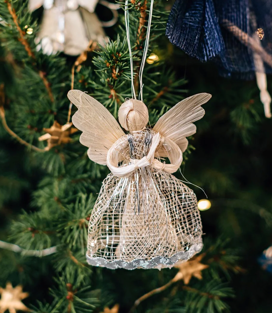 This sweet angel ornament is made entirely from natural materials. Sinamay is a natural woven fiber made from the stripped fiber of the abaca tree. Abaca is a banana-like tree...