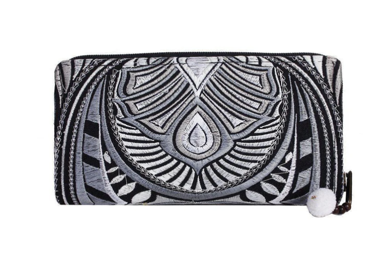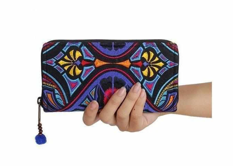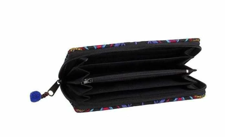 Our Tahj limited edition collection is created from gorgeous embroidery in contrasting, colorful hues. This gorgeous wallet combines an eye catching flower design with intricate embroidery. Has twelve slots for cards inside, two dividers and a zippered pocket for coins. It even fits a smart phone!