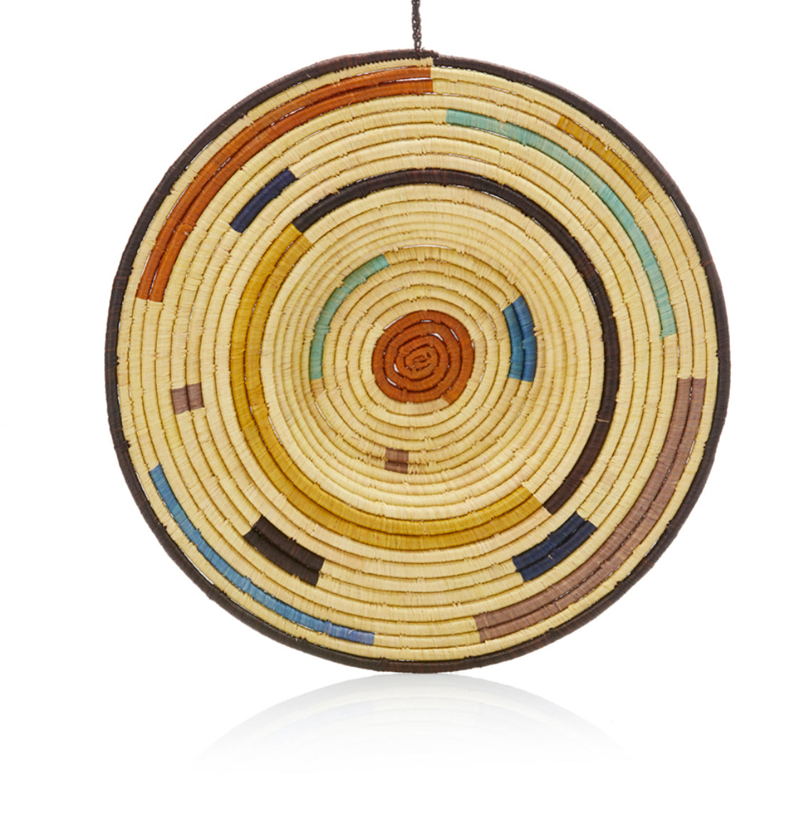 Hand-dyed natural raffia is woven into a natural background for splashes of color, by rural women artisans in Uganda who earn a living through traditional handcrafts. Perfect for display or as a decorative table piece. Hanging loop attached. Due to handmade nature, size, shape, and color may vary. Pair with our Sunburst Basket for a stunning wall display! Dimensions: 1 1/2"h x 15 1/2"dia.