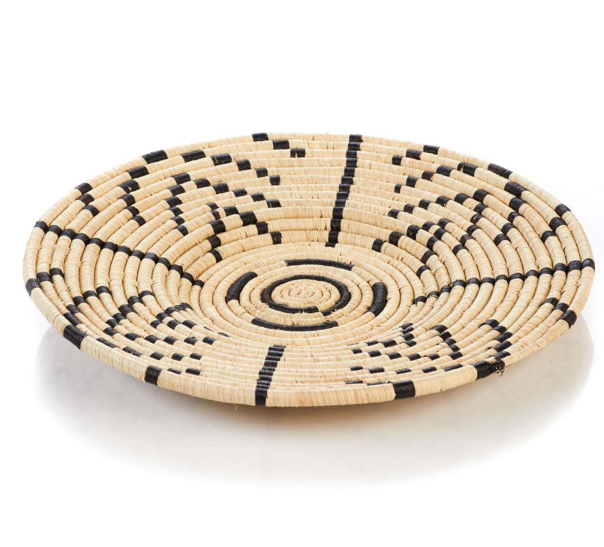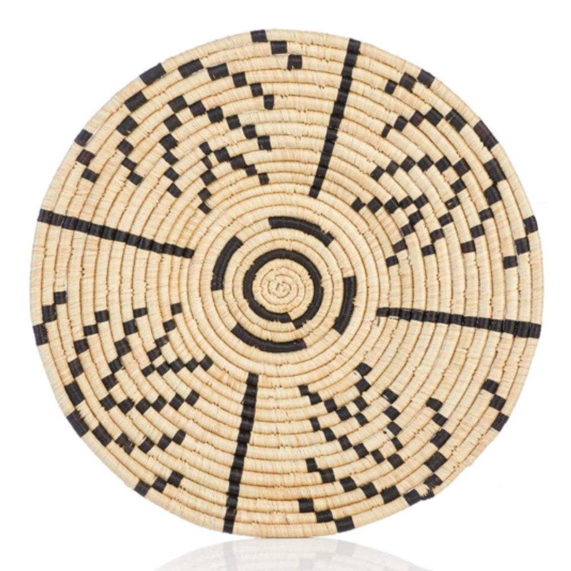 Inspired by African mudcloth, this decorative plate features black lines and chevrons in a petal-like formation on a natural raffia background. Made by rural women artisans in Uganda who earn a living through traditional handcrafts. Perfect for display or as a decorative table piece. Hanging loop attached. Due to handmade nature, size, shape, and color may vary. Dimensions: 1 1/2"h x 14 1/2"dia.