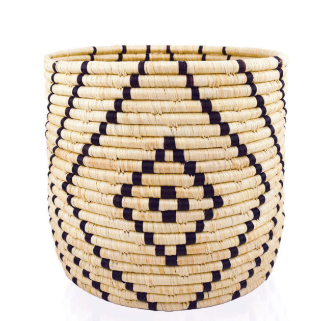 Inspired by African mudcloth, this handwoven raffia plant basket features dark chevrons contrasting a natural background. Made by rural women artisans in Uganda who earn a living through traditional handcrafts. Basket is not watertight. Due to handmade nature, size, shape, and color may vary. Dimensions: 9"h x 9"dia.
