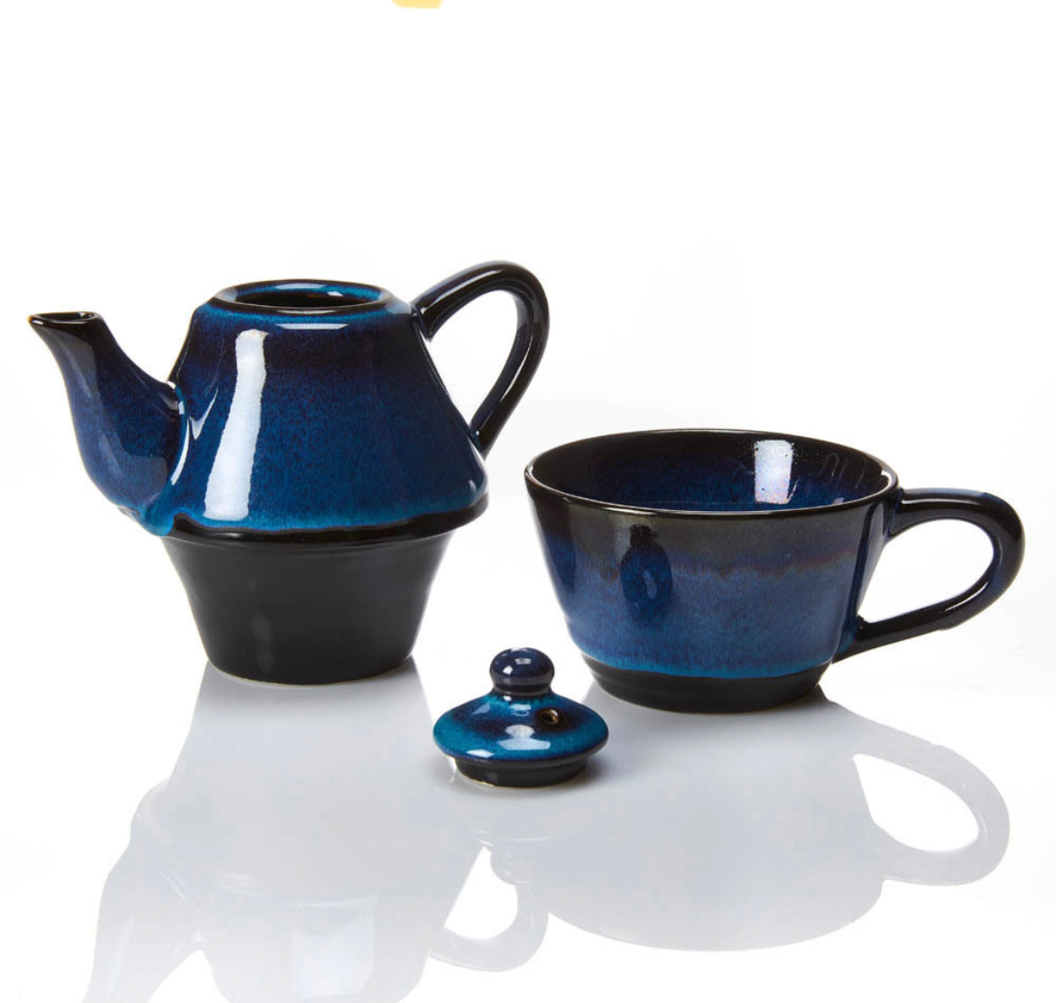 Glazed in colors that reflect the shores and depths of the lakes of Vietnam, this ceramic stacking teapot and cup offers a bold and beautiful look to any kitchen. Made in Bat Trang village, famous for its centuries-old tradition of creating fine ceramics. Dishwasher/microwave safe. Set includes teapot, cup, and lid. Teapot holds 14 oz. Cup holds 6 oz. Due to handmade nature and reactive glaze, coloration and pattern varies. Dimensions: Teapot: 5 1/2"h x 6 1/2"w x 4 1/2"d; Cup: 2 1/2"h x 5 1/2"w x 4"d.