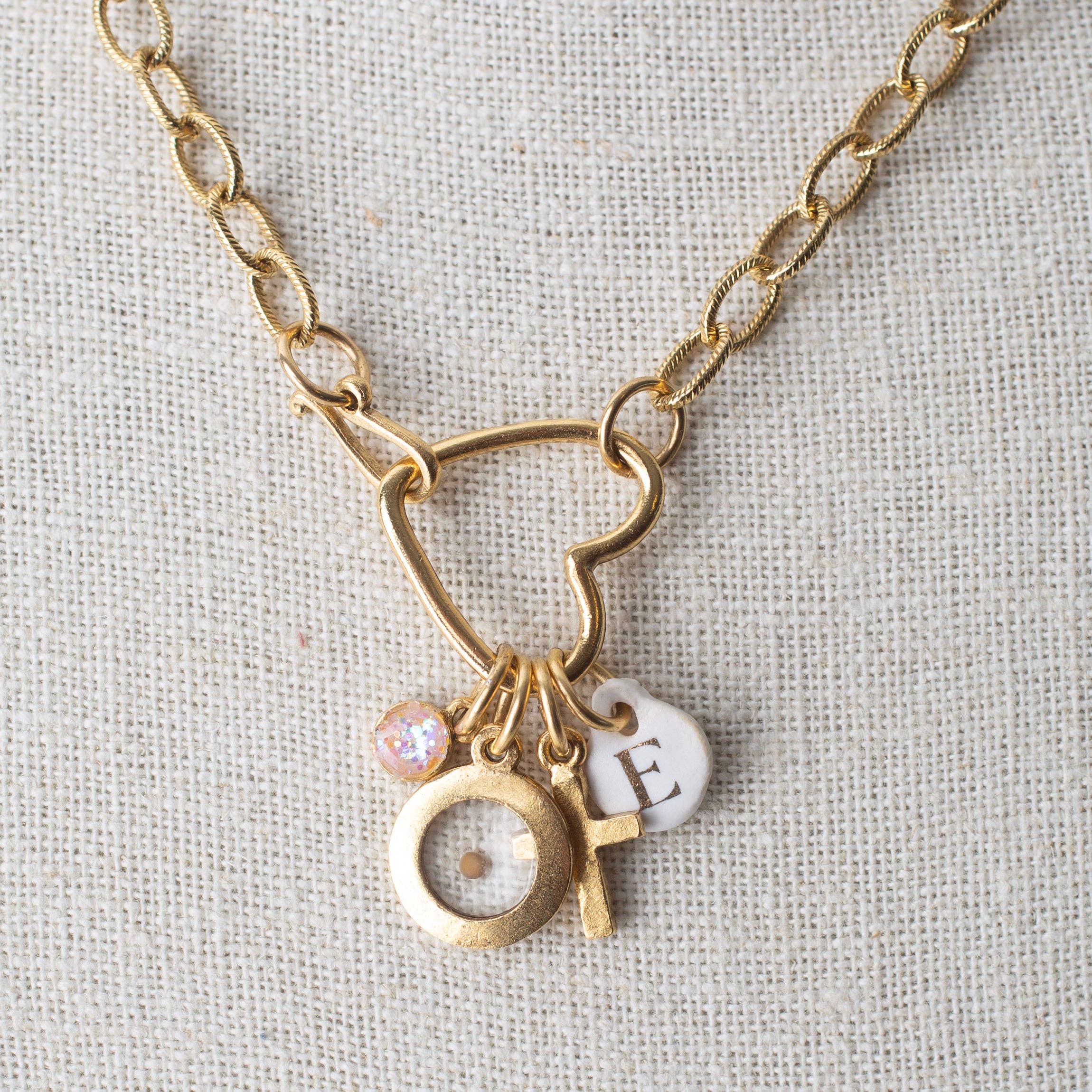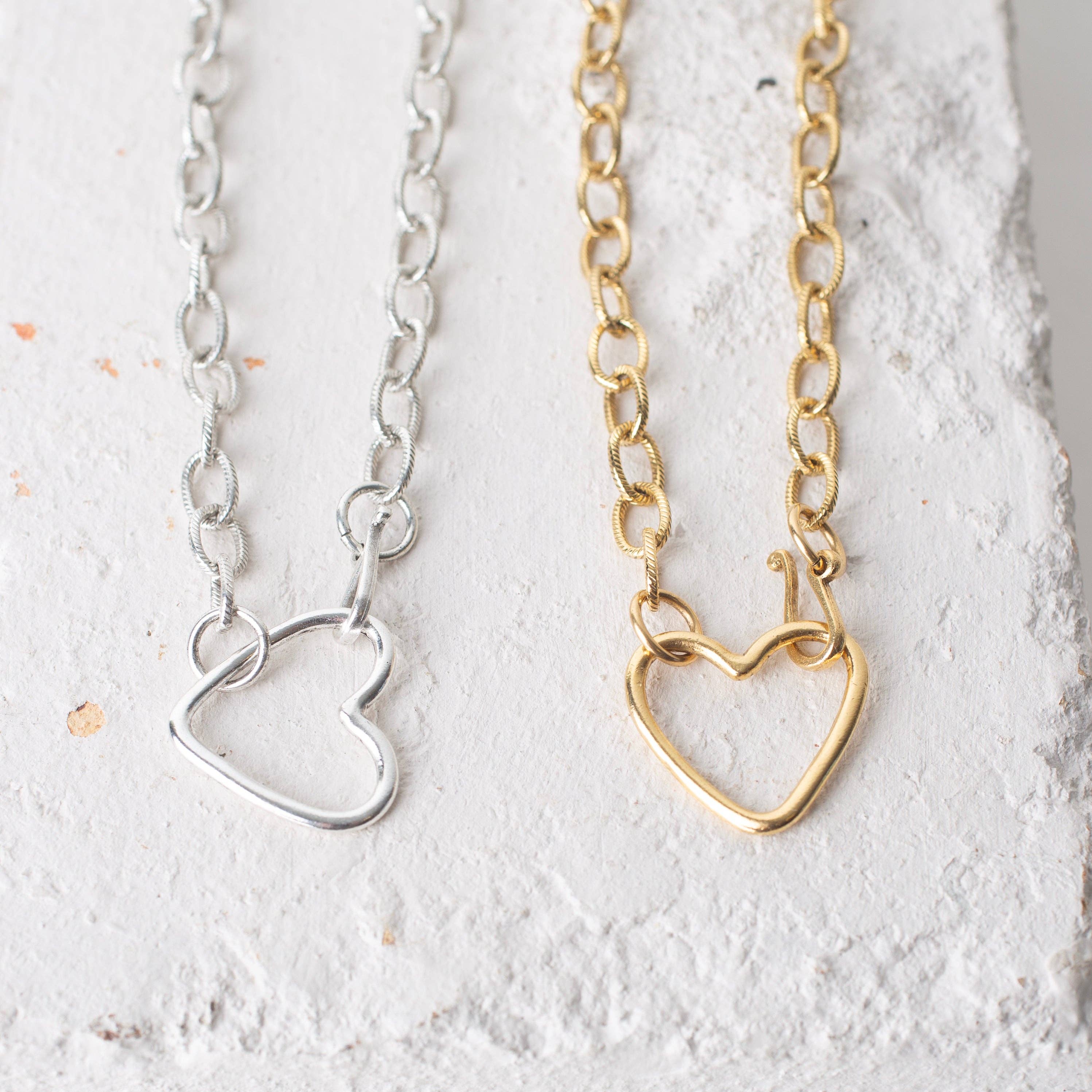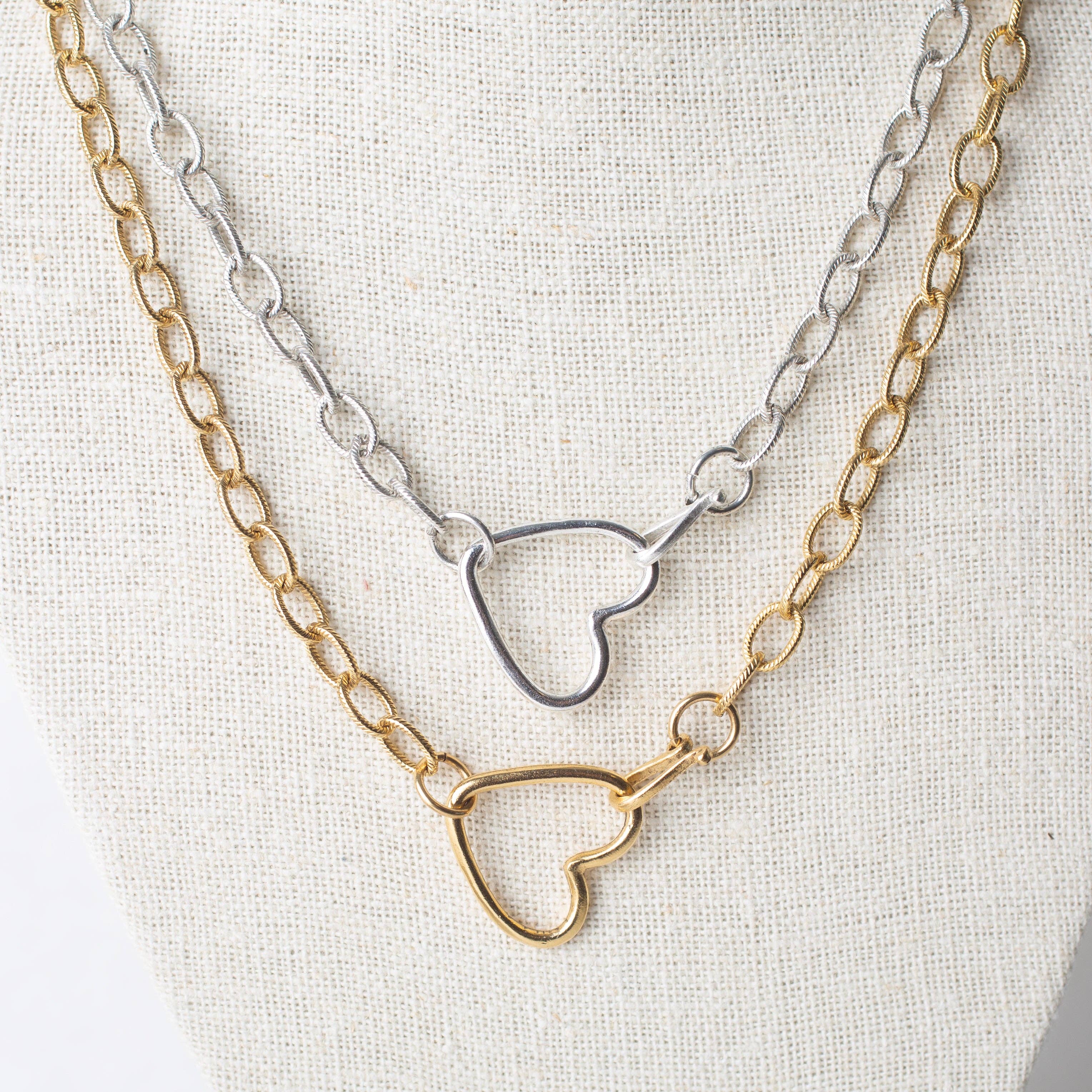 * Handmade in the United States, Assembled in the Dominican Republic * Brass Base Metal Chain with an Antiqued .999 Fine Silver Plate or 24K Gold * Finished with a whimsical hook and heart connector * 18" Length * Can be adjustable!