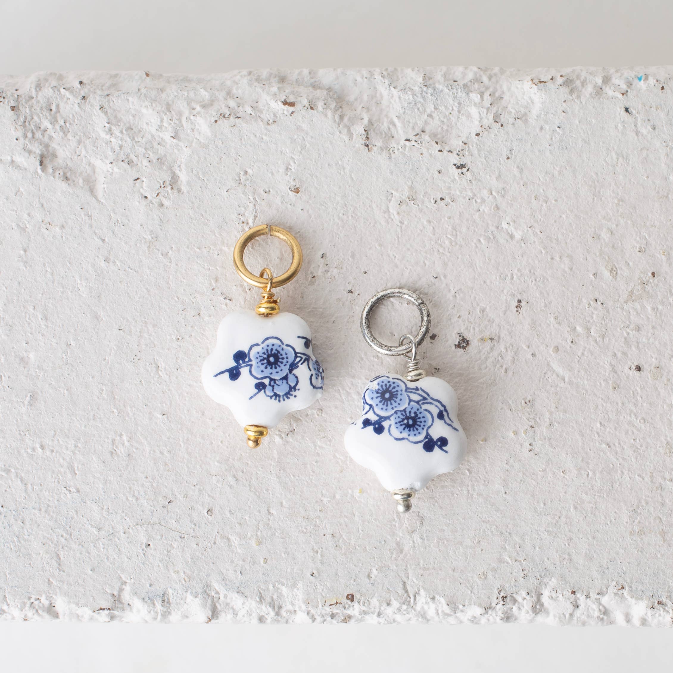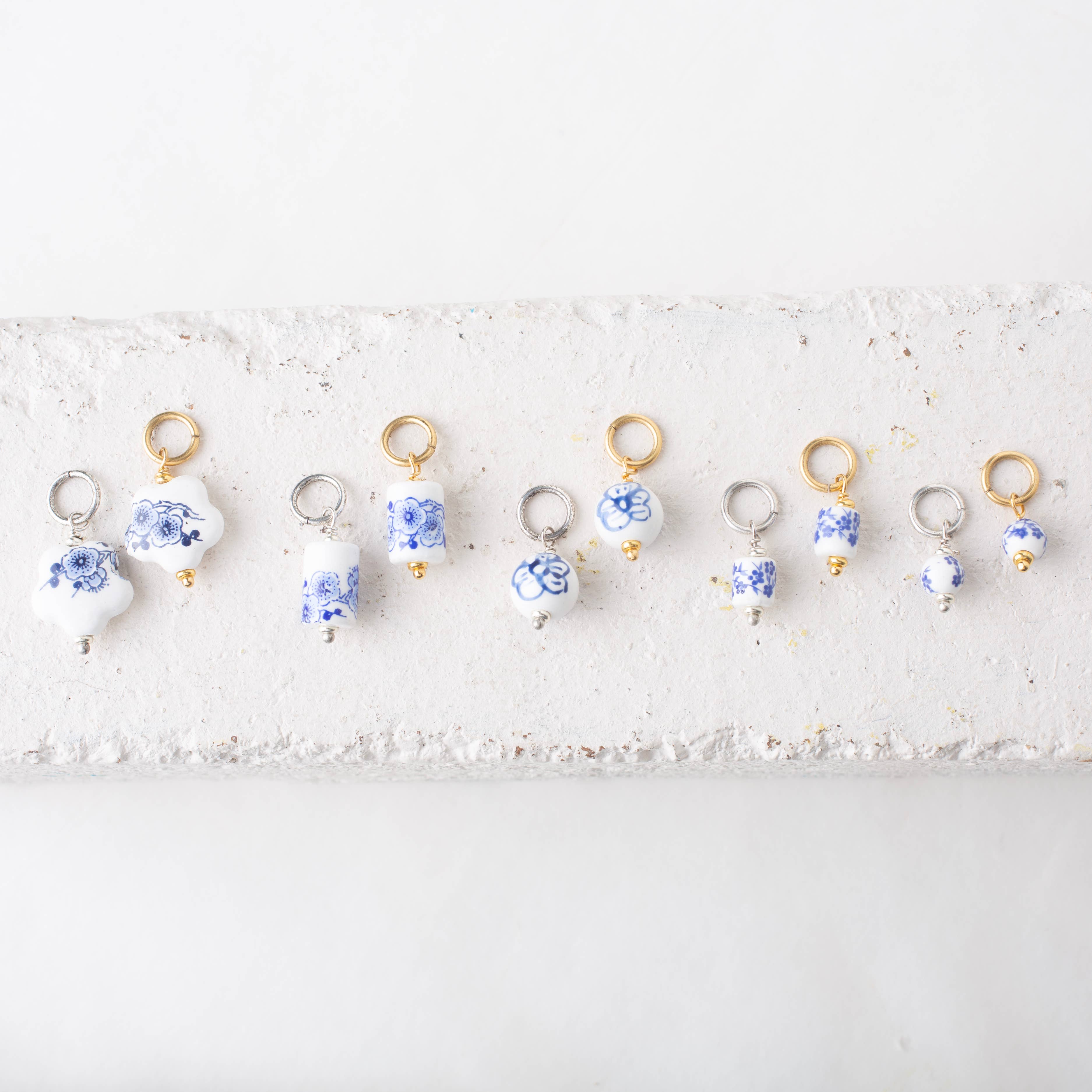 Sweet blue white chinoiserie porcelain bead charms are ready to add onto chains or bangles. Charms are made using handmade porcelain beads, brass-base headpins and jump rings, plated with 24k gold and .999 silver.