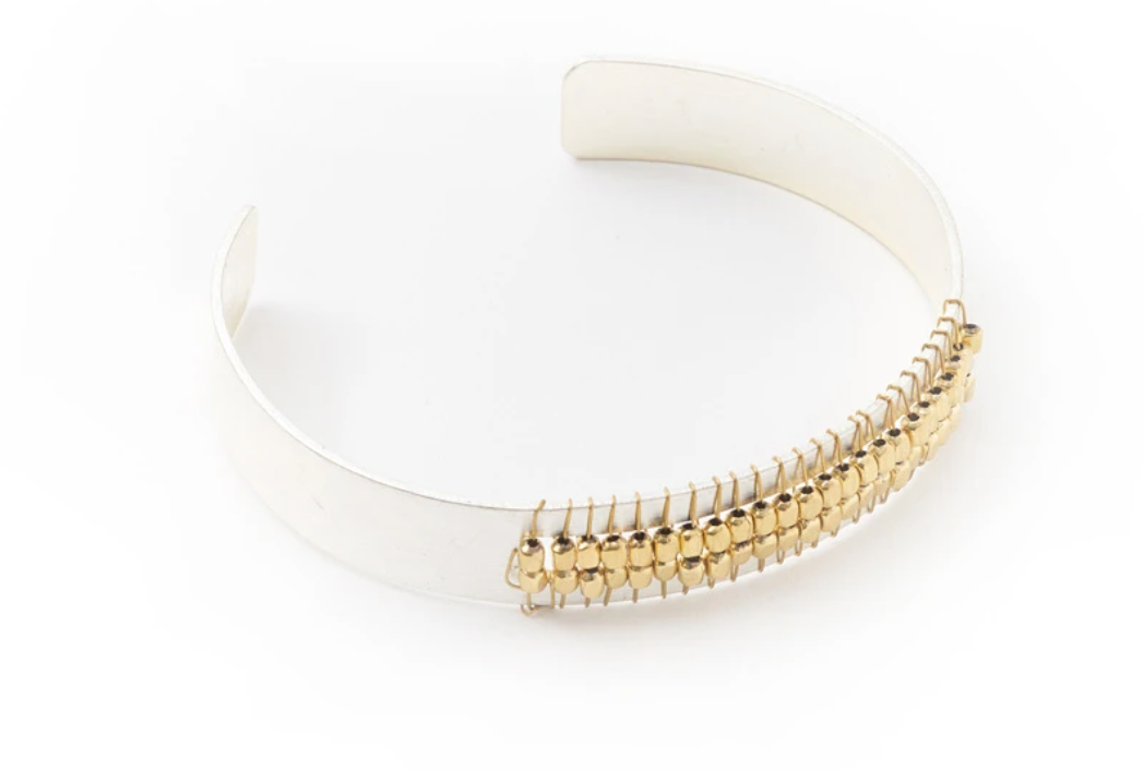 Our Bhavani Collection features shiny gold and silver finish elements for a touch of subtle sparkle. This handcrafted cuff bracelet features a smooth, silver finish band with shiny gold bead wrapping. Traditional jewelry making techniques of Old Delhi are thoughtfully applied in this modern design.