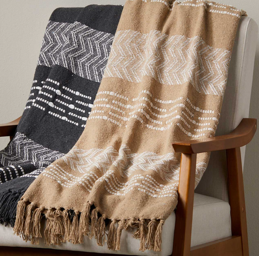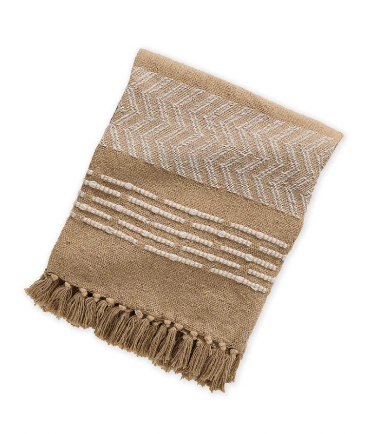 The ultimate in sustainable comfort, this remarkable cotton-blend throw blanket is made from recycled clothing, which is separated and spun into new threads. The threads are then over-dyed and re-woven on looms to create a cozy, lightweight decorative throw blanket in a sandstone and white chevron pattern. Knotted fringe ends. Machine wash. 60% cotton, 40% mix of polyester, viscose and rayon. Comes neatly wrapped with a band printed in India. Dimensions: 60"l x 50"w