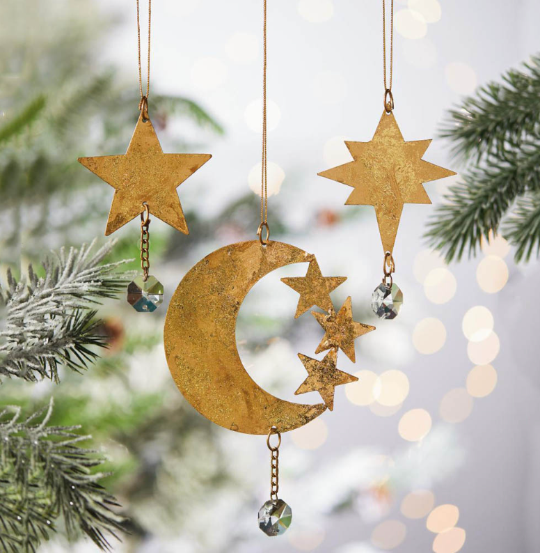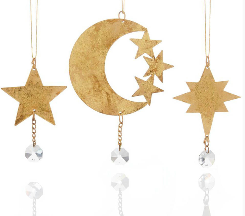 Partially-recycled iron is cut, smoothed and finished with gold foil, then accented with a sparkling glass bead that reflects the light to create these starry handmade ornaments. SOLD INDIVIDUALLY. Dimensions: Largest:...