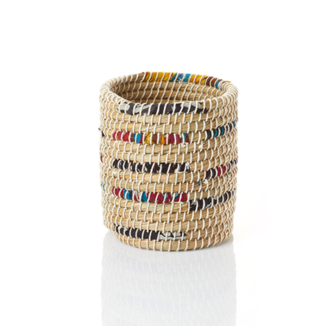 Artisans wrap even sections of upcycled cotton sari fabric and cotton string around natural handwoven kaisa grass, lending color and texture to this utensil holder. Perfect for spatulas, spoons, and other cooking necessities. 6 1/4"h x 6"dia.