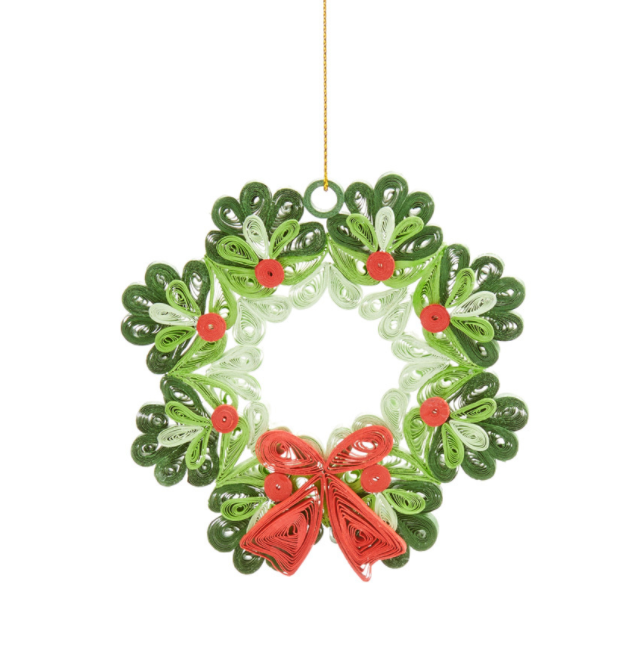 This beautiful ornament is made of colorful paper strips, each uniquely coiled, wrapped, and pinched by hand to create intricate leaf and holly berry patterns. Complete with a quilled paper bow. Hanging string attached. Dimensions: 3 3/4"dia.