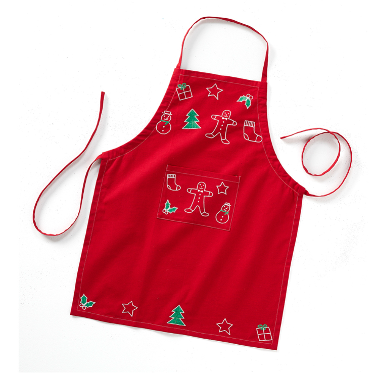Nothing says Christmas like holiday baking, and this adorable kitchen apron makes your baking even more festive! 100% cotton apron features hand-embroidred gingerbread men and other holiday motifs on a poinsettia red background. Front pocket and tie closure. One size fits most. Machine wash cold, tumble dry. Dimensions: 24"w x 30"h.