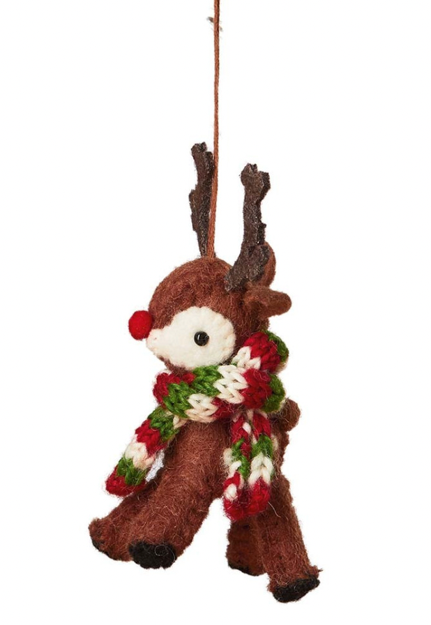 Needle-felted wool reindeer ornament feels right at home on your holiday tree. Comes dressed for winter weather in a colorful hand-knit scarf. Adorable! 5"h