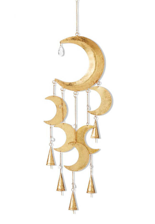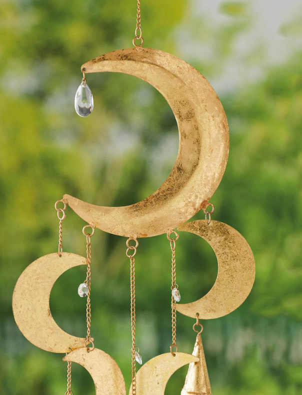 This one-of-a-kind handmade wind chime is crafted with partially-recycled iron, then painted and adorned with brass bells and crystal-clear glass beads. For use indoors or out. Pair with our other celestial decor pieces for a full night sky! Dimensions: 31"h x 10 1/2"w.