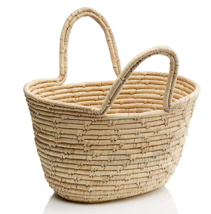 Carry all of your farmer's market finds or picnic supplies with this handwoven market basket. Kaisa grass. Dimensions include handles. 15 3/4"h x 9 3/4"w x 7 1/4"l at bottom; top measures 17"