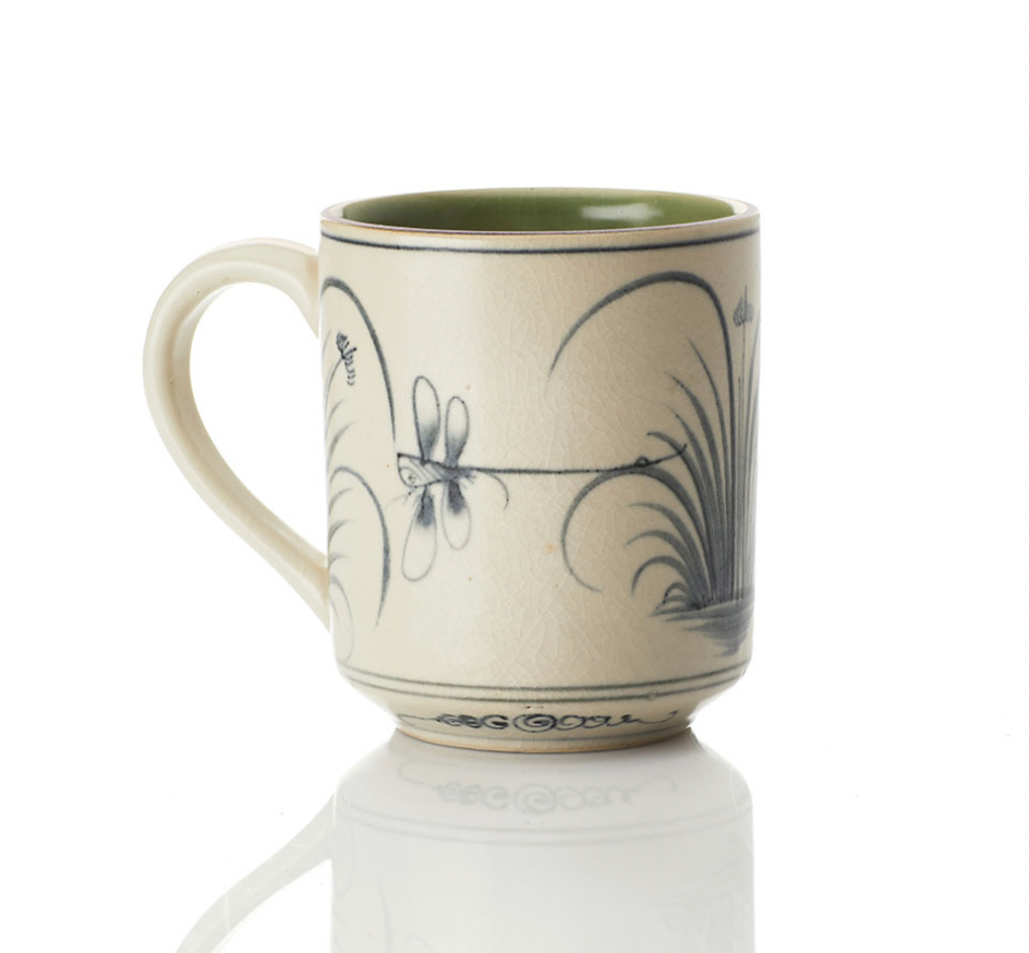 Hand-painted dishware created in Bat Trang, a Vietnamese village known for its centuries-old tradition of fine ceramics. Dragonfly and natural designs are hand painted in detail in deep spruce color to beautifully complement creamy white and celadon glazes. Due to variations in the clay, mug may develop a crackle finish. This is natural and part of the unique beauty of each piece. Oven, microwave, and dishwasher safe. Holds 16 oz. Dimensions: 5"h x 3"dia.