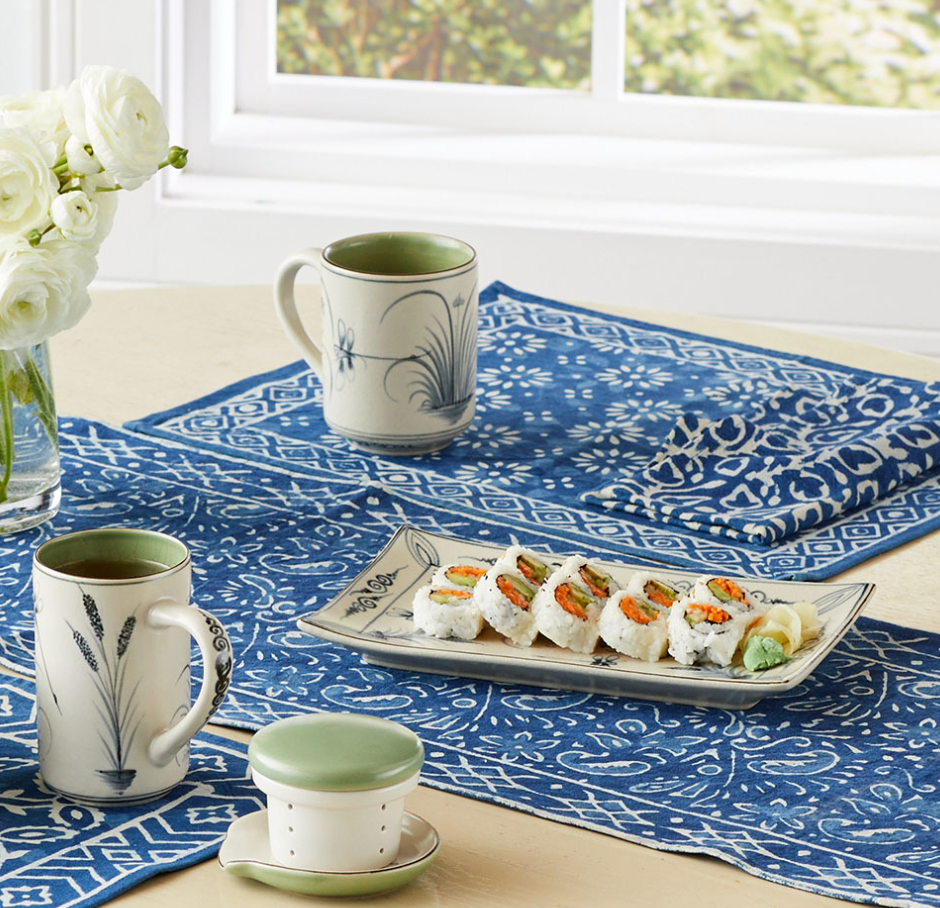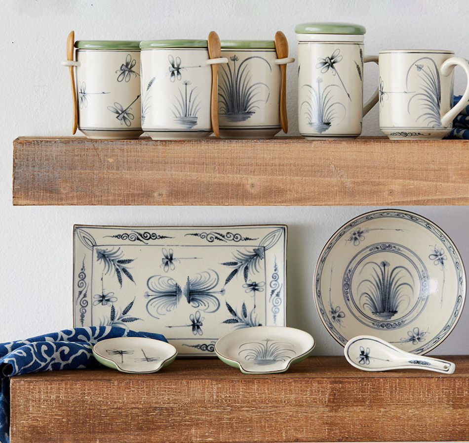 Hand-painted dishware created in Bat Trang, a Vietnamese village known for its centuries-old tradition of fine ceramics. Dragonfly and natural designs are hand painted in detail in deep spruce color to...
