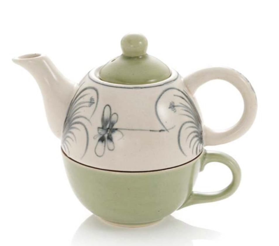 Hand-painted dishware created in Bat Trang, a Vietnamese village known for its centuries-old tradition of fine ceramics. Dragonfly and natural designs are hand painted in detail in deep spruce color to beautifully complement lightly crackled creamy white and celadon glazes. Oven, microwave, and dishwasher safe. Teapot holds 16 oz., cup holds 8 oz. 5 1/2"h x 7 1/4"w x 4 1/4"d