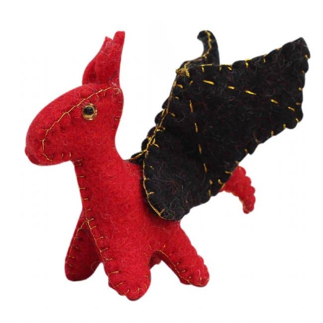 This handmade felt dragon is 5 inches by 3.5 inches in size, made from natural wool and colored with Azo-Free dyes.