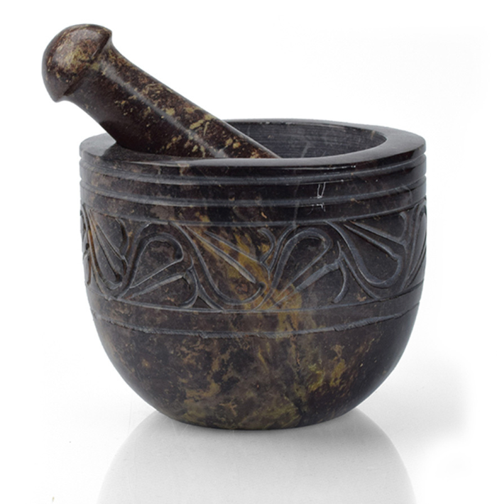 Fresh herbs and spices taste best! Natural carved gorara stone mortar has a vining leaf design and is polished to a smooth finish on the exterior. mortar: 3 1/4"h x 4"dia, pestle: 4"l x 1 1/2"dia