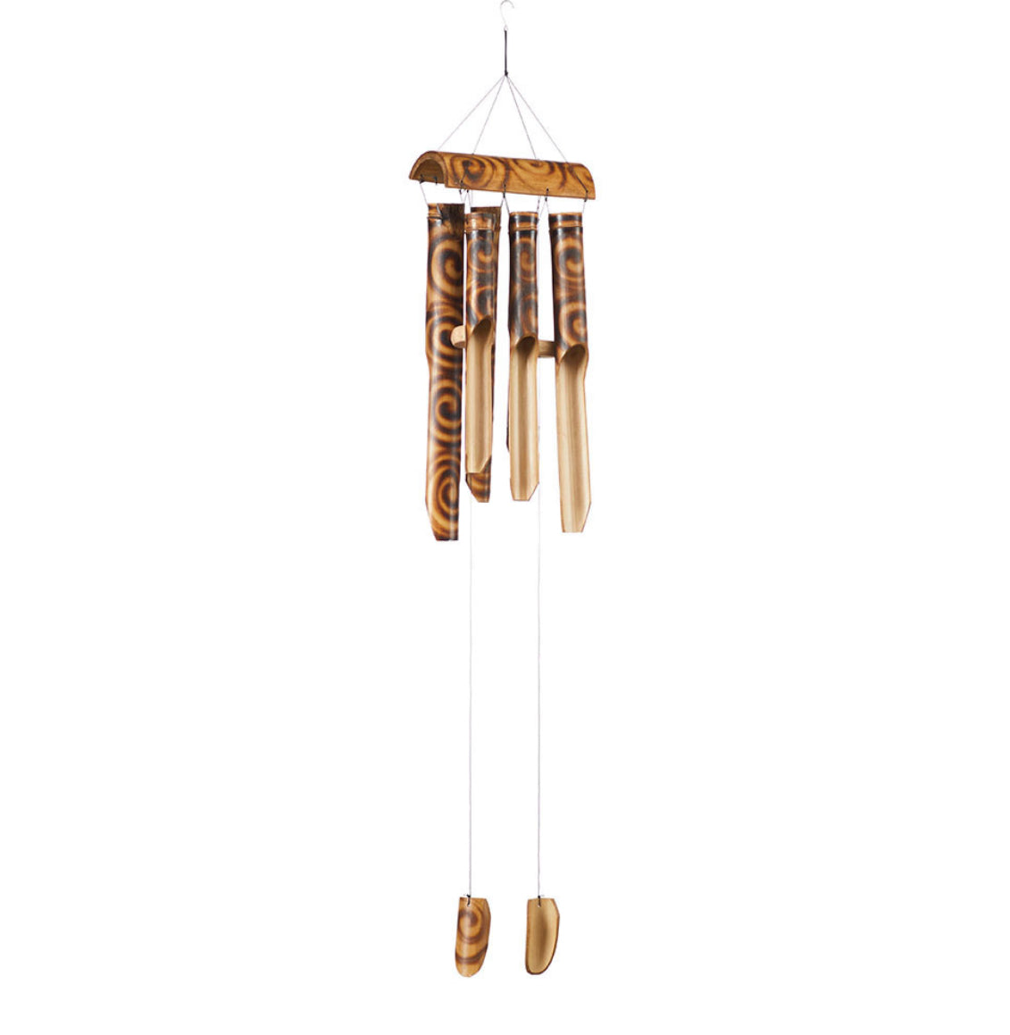 These handmade chimes with bamboo pipes are embellished with a traditionally-inspired charred whirlwind pattern, and produce a gentle sound when moved by the wind. Dimensions: 44 1/2"l x 8"w