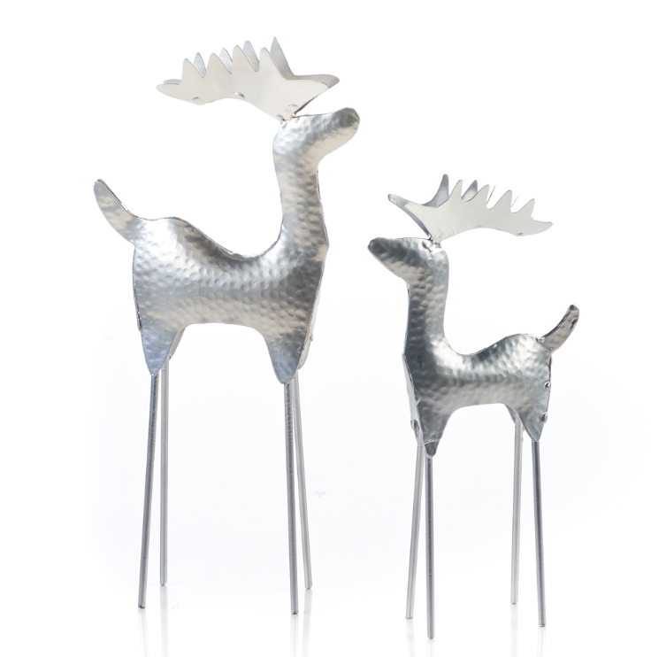 These hammered, partially-recycled metal reindeer will bring modern appeal to your holiday decor. Each reindeer is hand made by artisans in India, who cut, shape, and hammer each piece. Sold Individually. Dimensions: Sm: 9 1/2"h x 1 1/2"w x 4 1/2"l; Lg: 12"h x 1 3/4"w x 5 1/2"l.