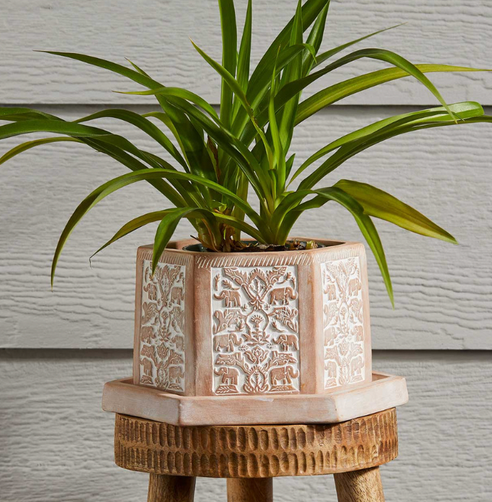 This hexagonal terracotta planter features a whitewashed exterior with a textured elephant and floral pattern, and includes a saucer.