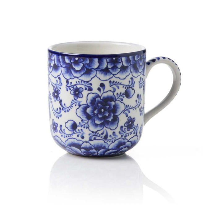 Crafted from natural ceramic in the village of Bat Trang, known for its long tradition of creating fine ceramics, this gorgeous and hand-painted chinoiserie mug features indigo floral motifs on a white background. Looks especially beautiful when paired with our other Indigo Blooms ceramic pieces! Microwave and dishwasher safe. Dimensions: 3 1/2"h x 3"dia