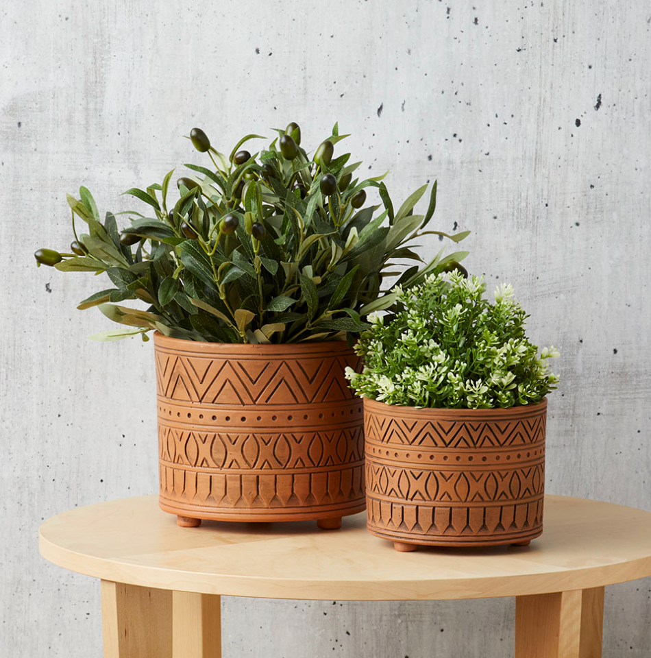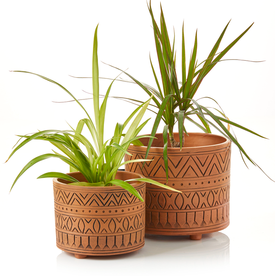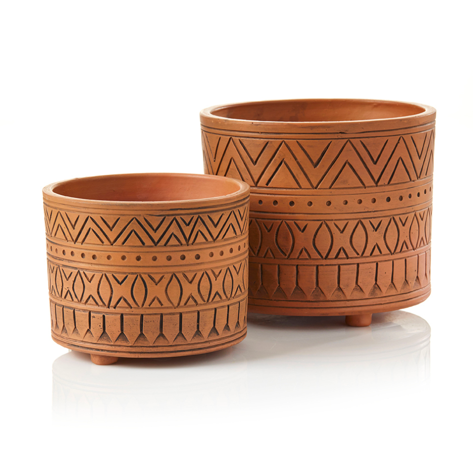 Natural terracotta shaped into cylindrical planters and etched with a modern geometric design, then blackwashed for rustic appeal. Each handmade terracotta pot features drainage hole and feet. Protect from rain to extend life of planters. For indoor use, pair with tray underneath or interior pot. Sold Separately