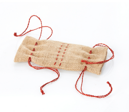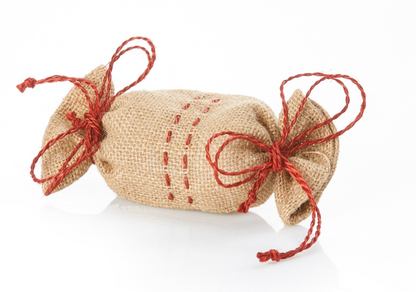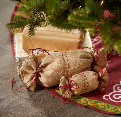 This cute and reusable jute gift wrap adds rustic charm to any gift while saving on paper. Features holly red accents and drawstrings on each open end. Dimensions: Small 7"l x 3 1/2"w. Large 12"l x 6"w. Sold Individually