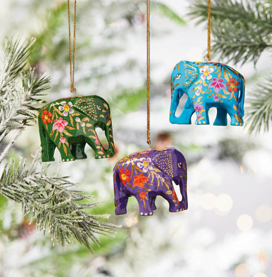Recycled papier mache elephants are each hand-painted with an exquisite floral pattern to make your holiday tree bloom with traditional style and color. Gold hanging loops attached. Dimensions: 2"h. SOLD INDIVIDUALLY