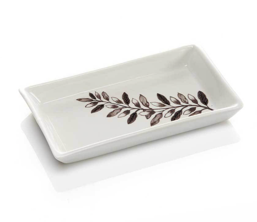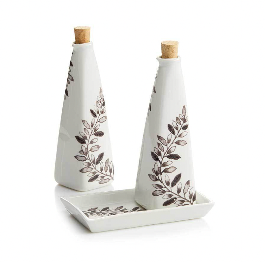 This beautiful ceramic olive oil and vinegar set features a hand-painted vine design on cream-colored ceramic, bringing a fresh look to your table. Made in Bat Trang village, famous for its centuries-old tradition of creating fine ceramics. Dishwasher and microwave safe. Set includes two cruets with cork stoppers and tray. Cruets: 7 1/2"h x 2 1/2"sq at base; Tray: 6 1/2"l x 3 1/2"w