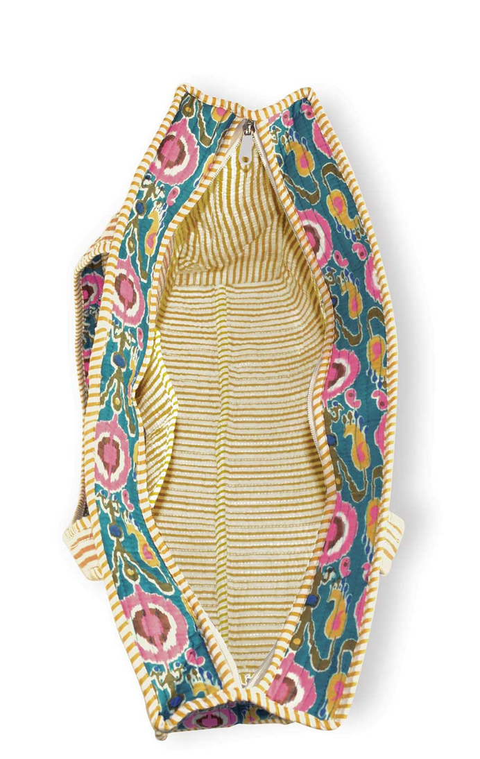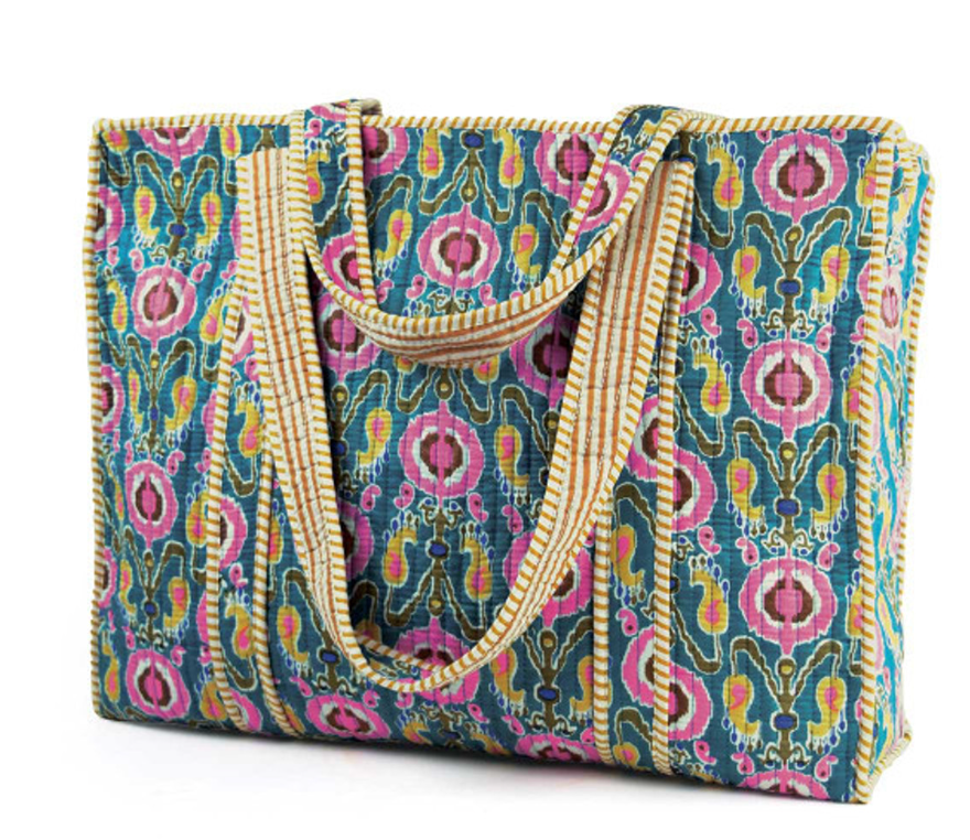 Carry culture with you wherever you go with this artisan-made tote bag, crafted from 100% cotton fabric. Using traditional techniques, the fabric is ikat-dyed and then screen-printed with vibrant paisley motifs, creating a bold, globally inspired look perfect for any occasion. Each tote is lightly padded with surplus cotton fabric and accented with hand-stitched kantha embroidery in multicolored threads, adding both strength and texture. The roomy interior is fully lined in coordinating cotton and features a slip pocket to keep your essentials organized. Sturdy, stitched handles and a zip top closure make it ideal for everyday use—from errands to travel. To preserve the structure and stitching, hand wash cold only.