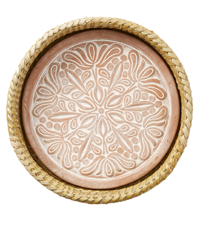 Whitewashed terracotta stone is incised with an Indian-inspired design and sits within a handwoven kaisa grass basket. Warmer is oven safe. One of our most popular gift items! Dimensions: approx 3 1/2"h x 11"dia.