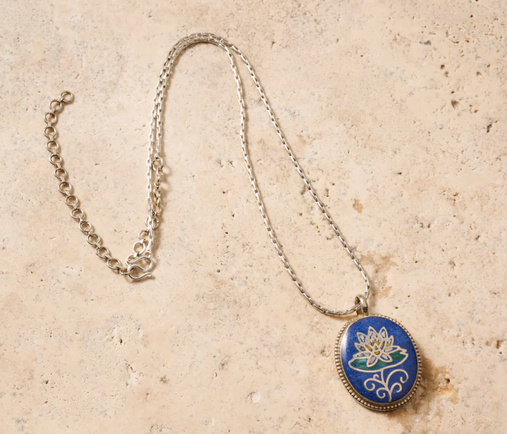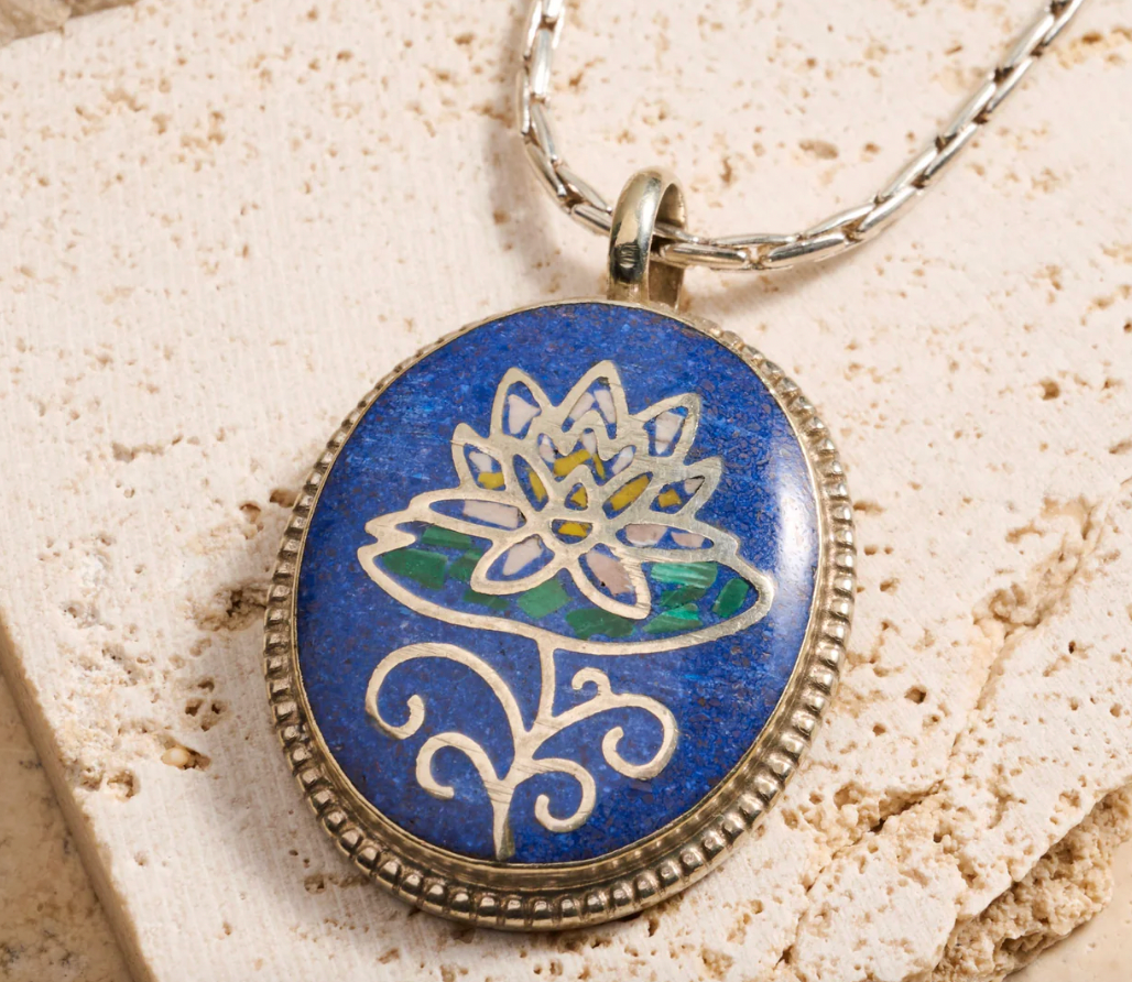 Add a touch of unique beauty to your look with this beautiful necklace. The intricate lotus design is crafted with white metal and filled with powdered stone in vibrant malachite and lapis. Featuring an adjustable chain and S clasp closure for easy wear, this versatile piece is a stylish addition to any outfit! A Ten Thousand Villages Exclusive handcrafted in Nepal.