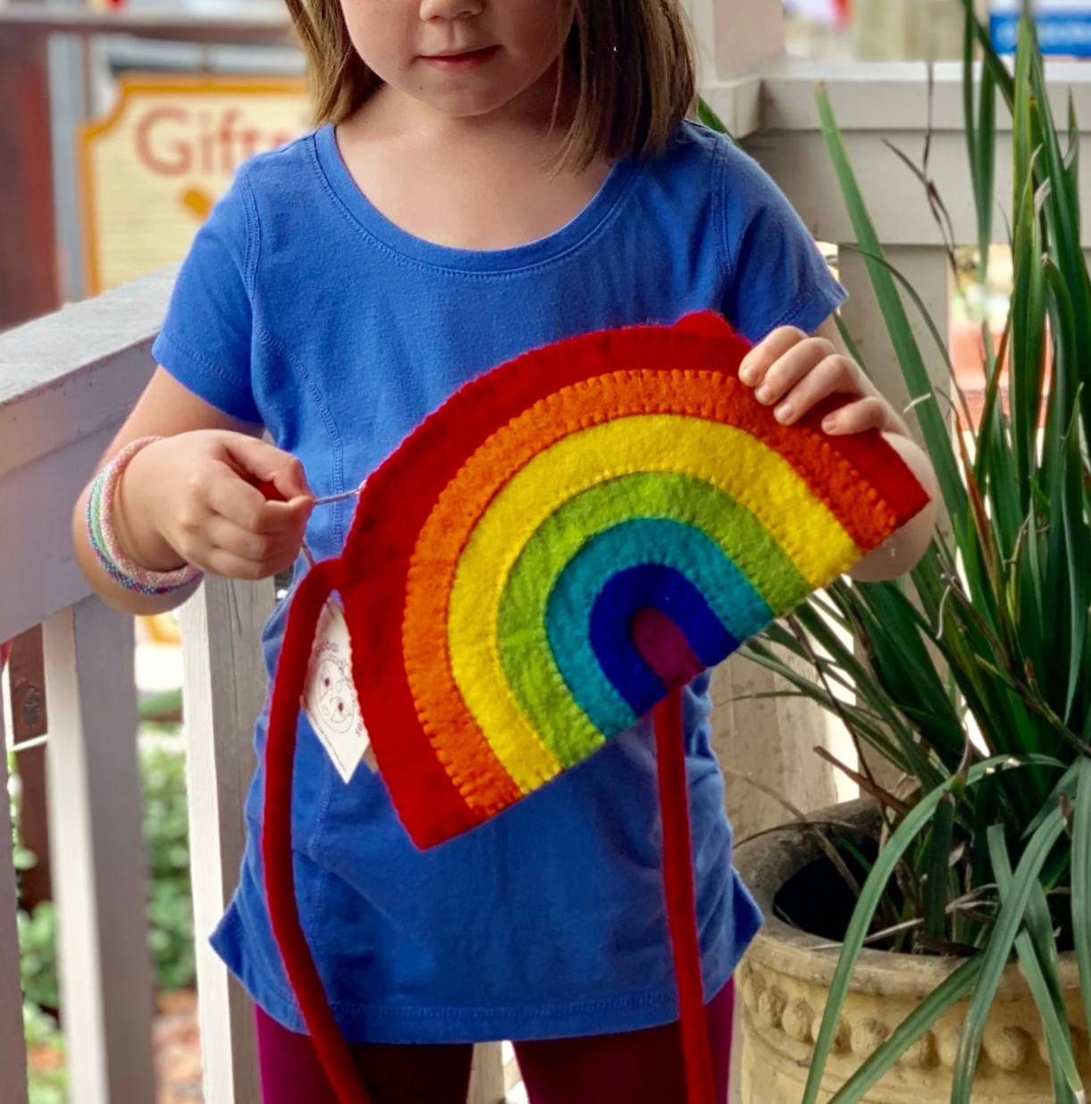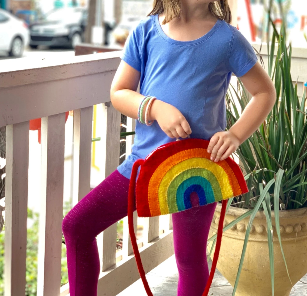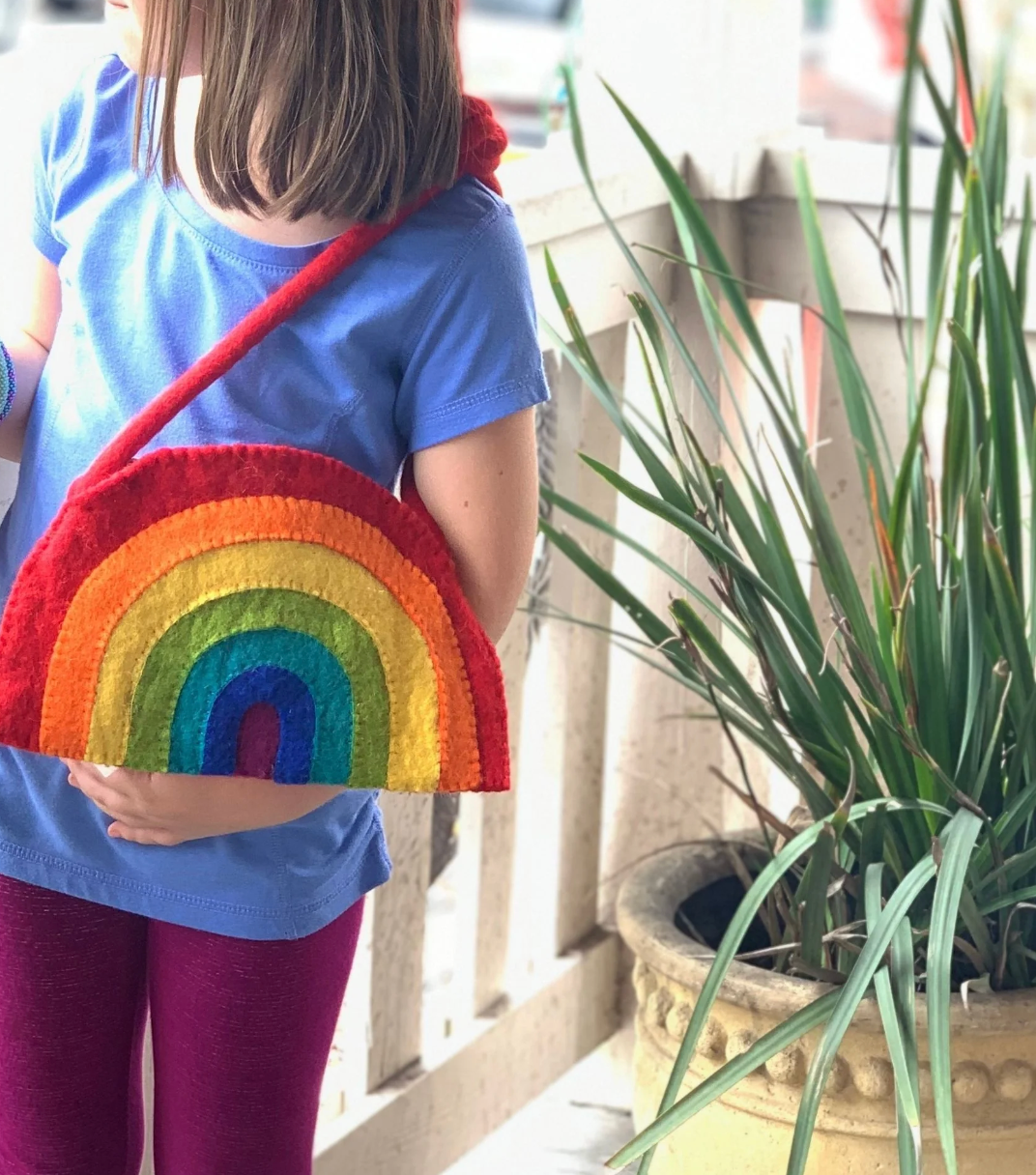 So darn cute, this felt bag featuring a rainbow is handmade by Nepalese women artisans from 100% all-natural felted wool, The lined purse with zipper closure measures 11 inches by 7 inches and has a 20-inch felted strap.