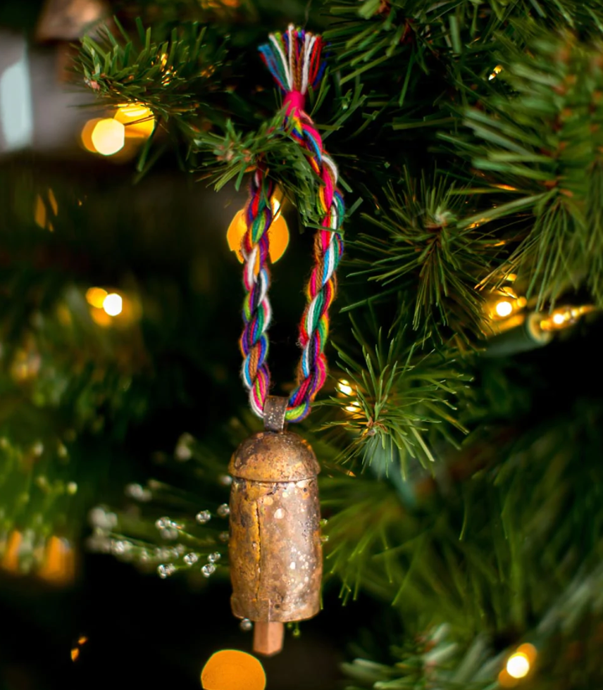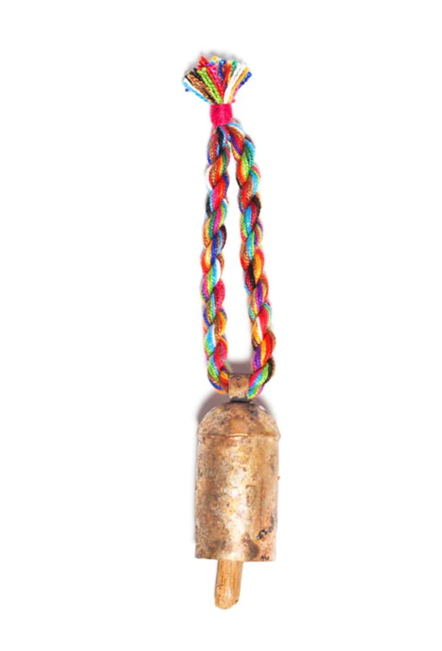 Brighten your days with this handmade, bell ornament crafted from recycled iron sheets, covered in copper alloys. A mini version of our classic wind chime bells, with a bright rainbow twist of a multi-colored braided loop with bright pink thread wrapped at the top. Use as a holiday ornament, or decorate door knobs, patios, windows, walls and more.