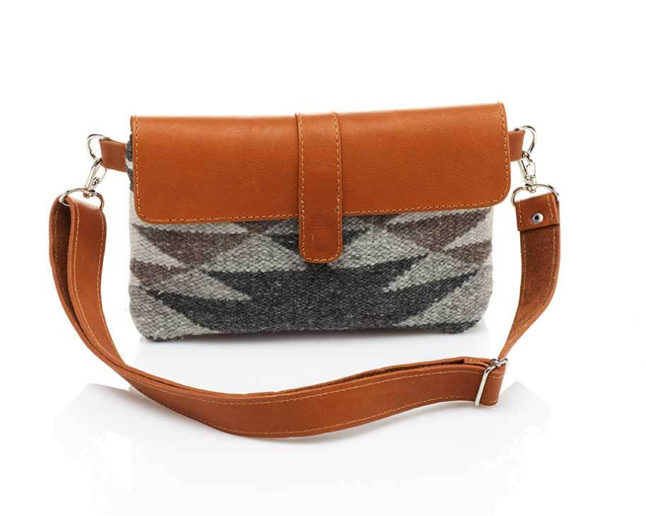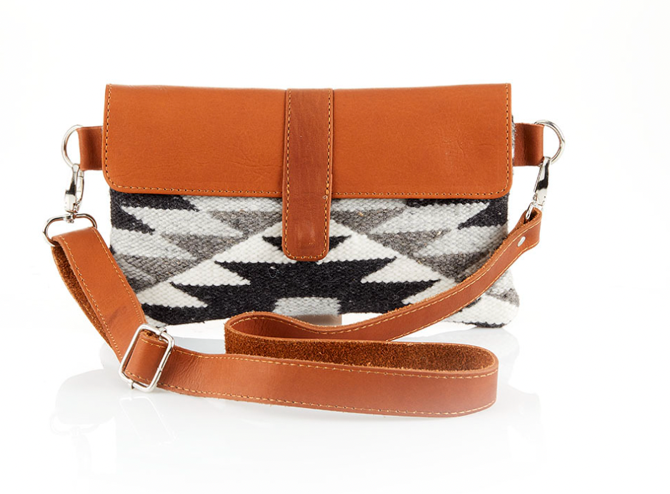 Handwoven on a manual loom from cotton and wool, this unique waist bag uses a traditional tapiz-style weave in neutral gray, cream, and black, accented by soft, genuine leather. Features silver hardware with zip closure. Black nylon lining. Adjustable 39"l leather waist strap with clip. Bag is 48"l with strap. Pattern may vary, let us choose for you. Spot clean. 5"w x 9"h