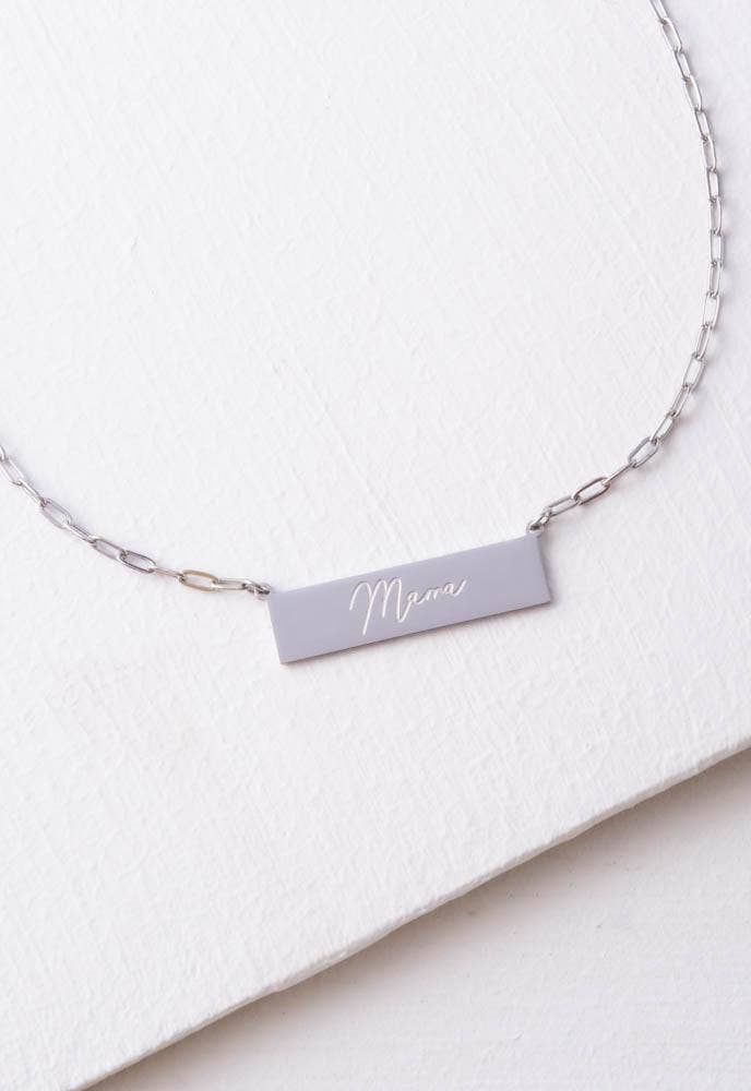 Our Motherhood celebrating Mama Necklace is a lightweight, dainty bar made for everyday wear. Crafted in stainless steel each rectangular-shaped bar is delicately engraved with every child’s favorite word “Mama.” Here...