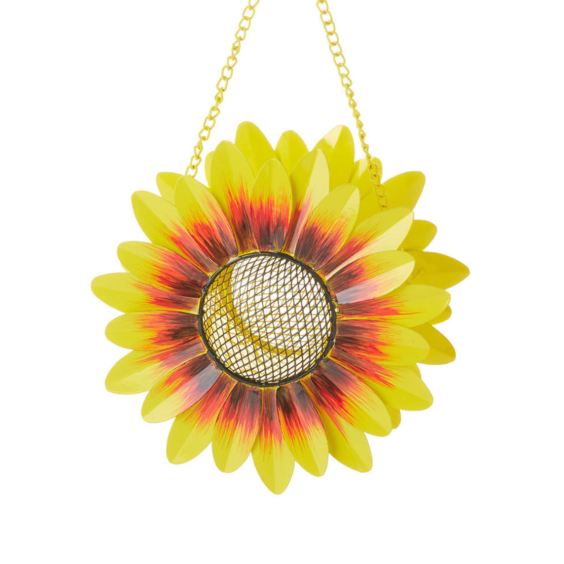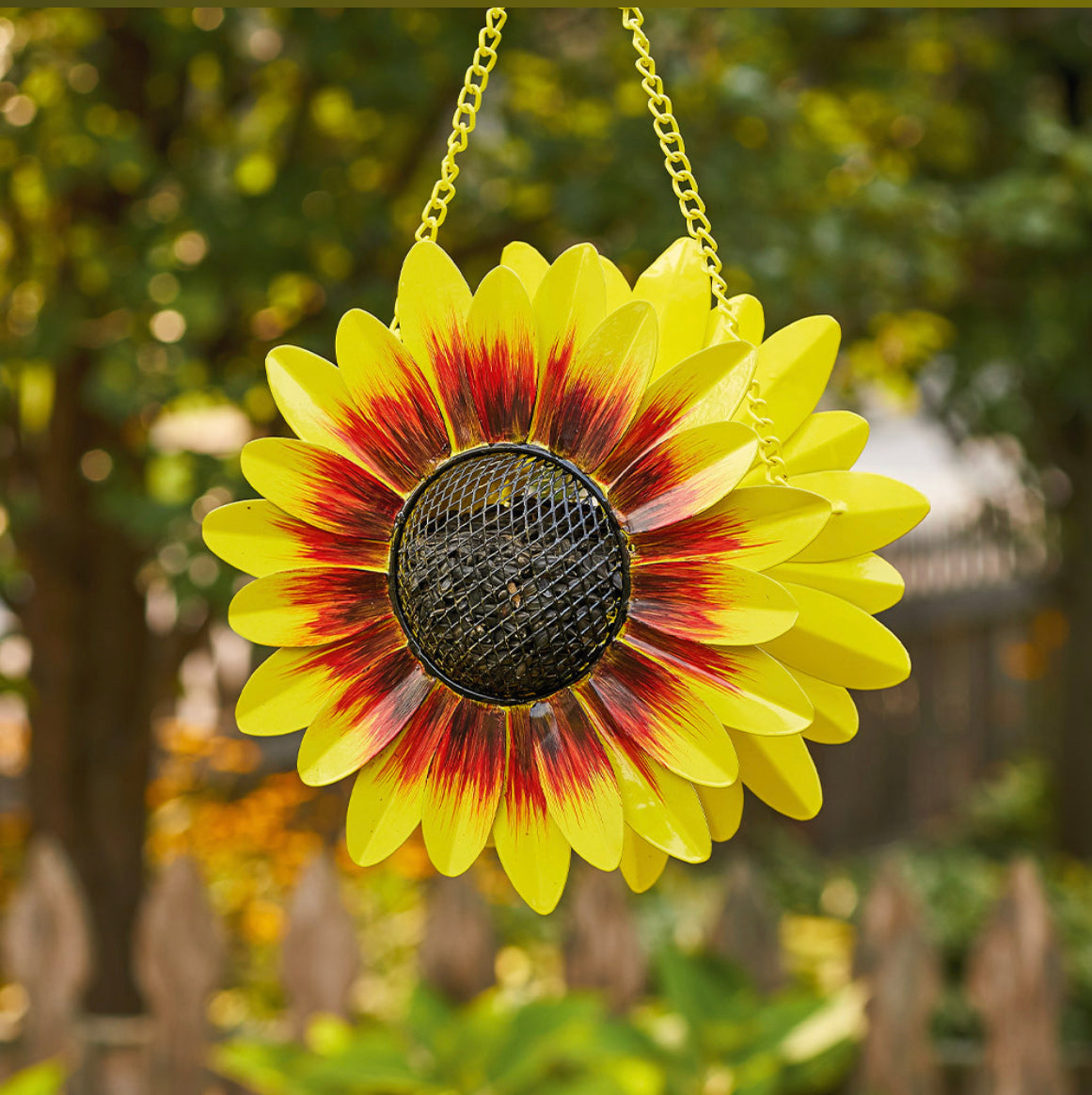 Handmade from hand-painted, partially recycled metal, this bird feeder brings a burst of color to any garden or patio. Comes with hanging chain. Latched door at the top for filling. Fill with sunflower seeds to attract cardinals, finches, woodpeckers, and more to your backyard! 17"h x 9 3/4"dia.